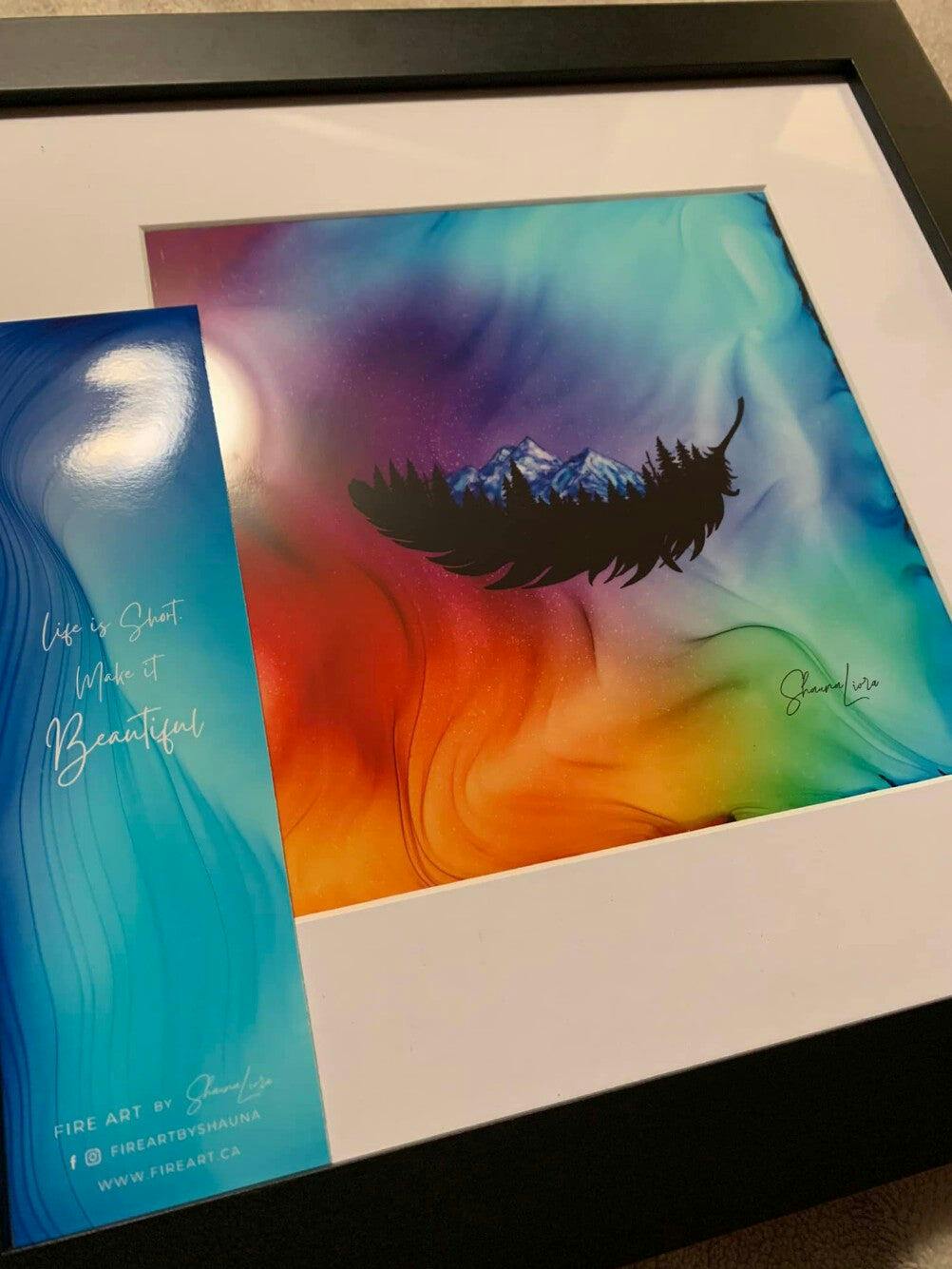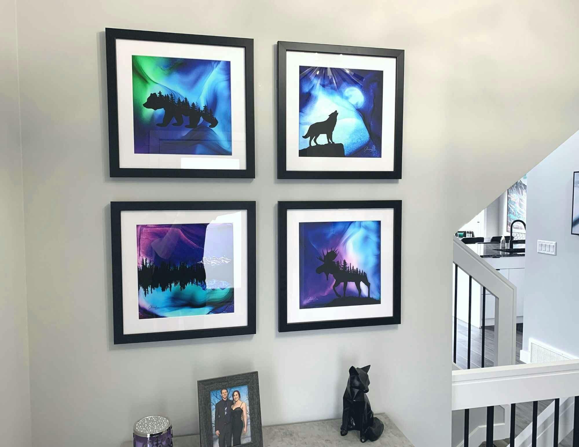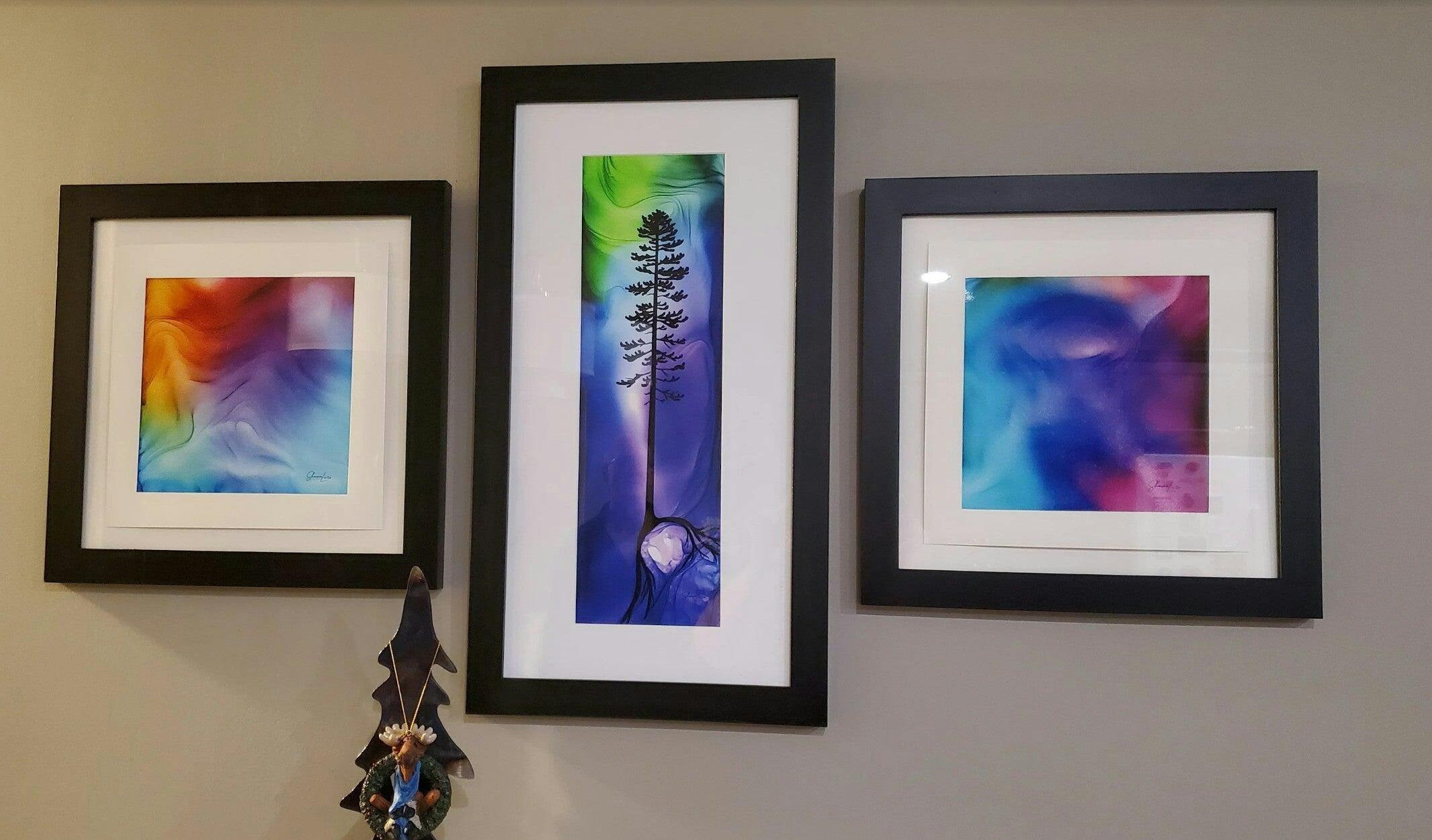 We carried them in our gift store and now have begun a collection in our new home. We chose Happiness, Touch the Sky and Euphoria to display together. We are huge fans of the Northern Lights and tree-root symbols and these colourful prints remind us of their beauty every day. Thank you Shauna for your passion, talent and excellent customer service!