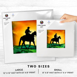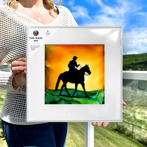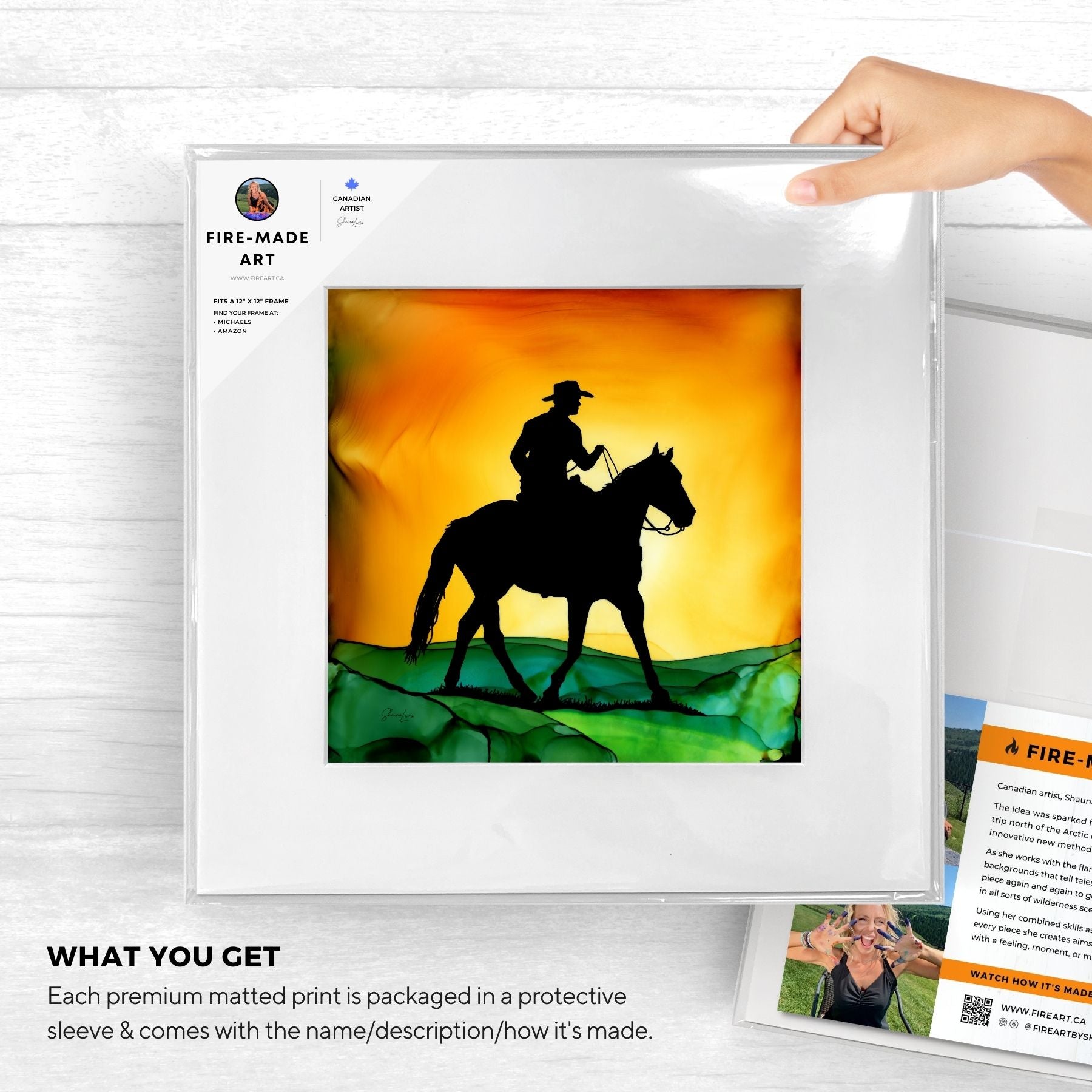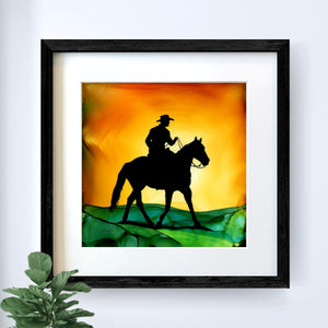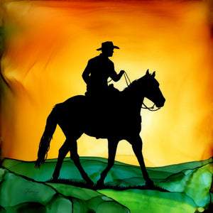 The golden aura that emerged from the fired ink inspired me to create this piece about living life free in the saddle- where a roaming rider returns in the soft, warm light of sunset.