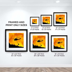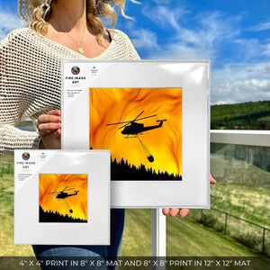 Hovering above the blazing fire, this chopper flies on after quenching the flames. This piece, made with the very fire they respond to every day, tells the story of these unsung heroes, battling remote danger, and keeping our forests and communities safe.