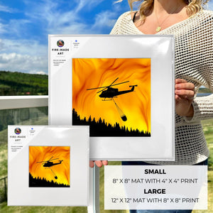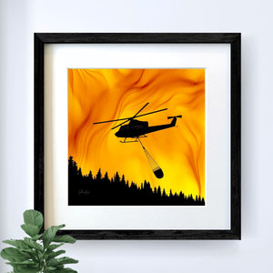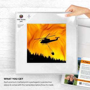 Hovering above the blazing fire, this chopper flies on after quenching the flames. This piece, made with the very fire they respond to every day, tells the story of these unsung heroes, battling remote danger, and keeping our forests and communities safe.
