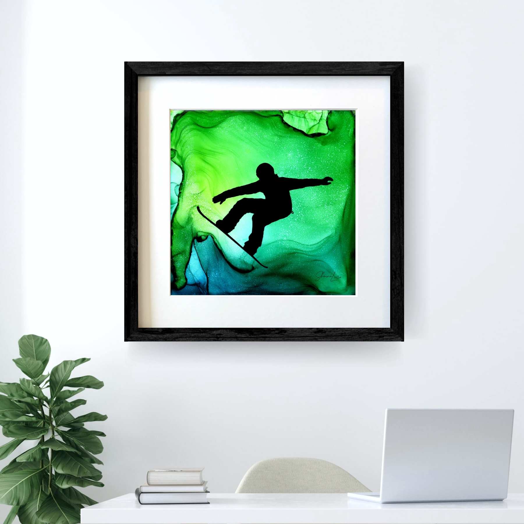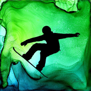 When I created this vivid fire and ink pattern it embodied for me the essence of airborne life- that surging adrenaline rush that courses through the body while soaring through crisp winter air on your snowboard.