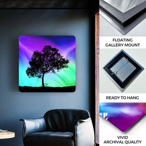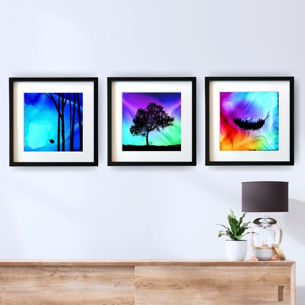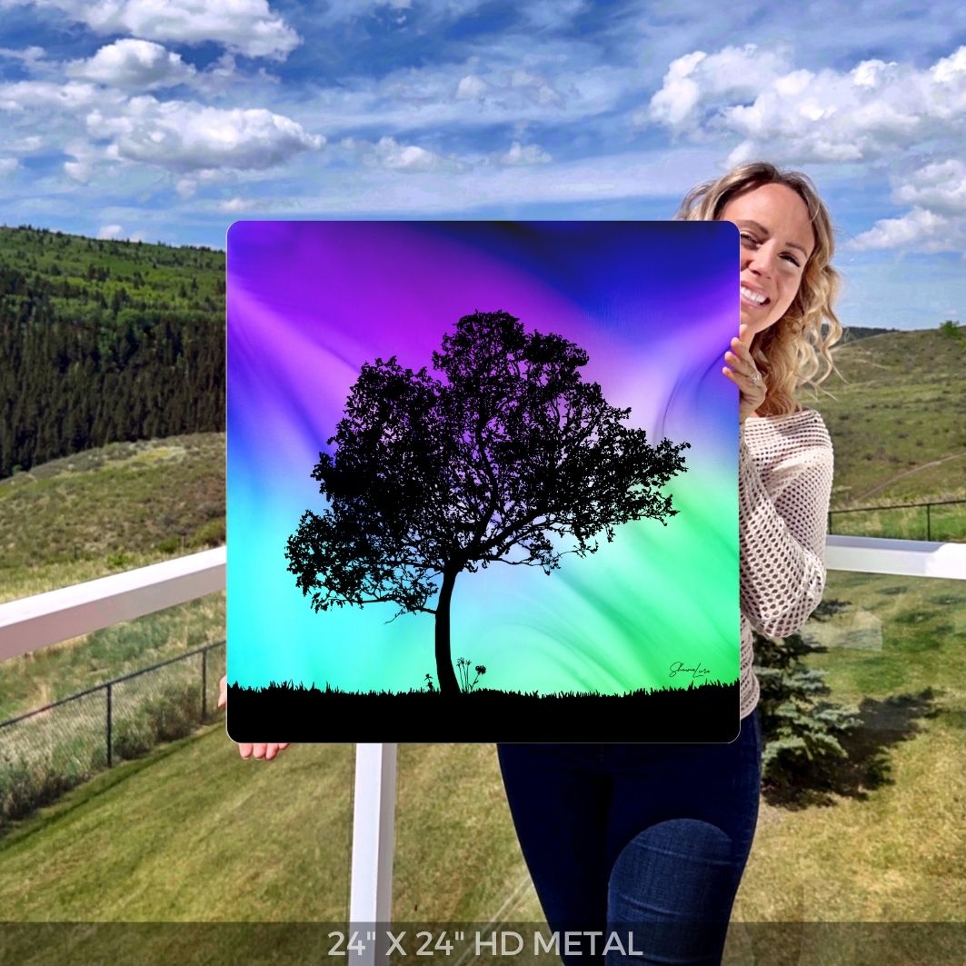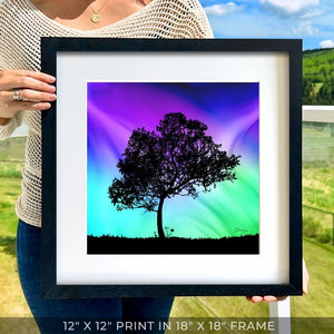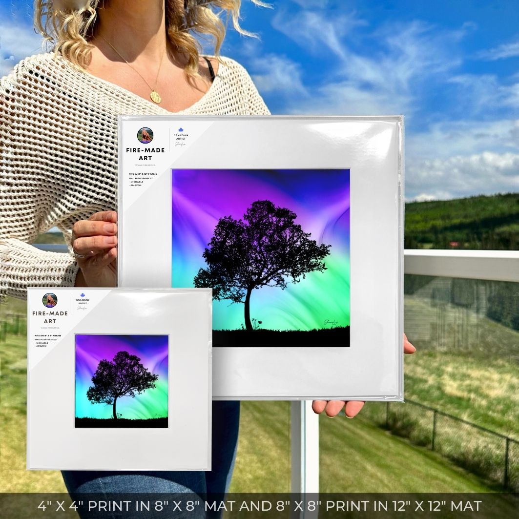 This artwork was born from a desire to capture the serenity I feel in nature. The tranquil, northern lights-like designs created by the fire and ink inspired me to paint this tree, which is beautifully framed by the aurora night. Trees resonate with me deeply; their ability to remain unshaken through changing seasons and storms reminds me to seek and find my inner calm, no matter what comes my way.