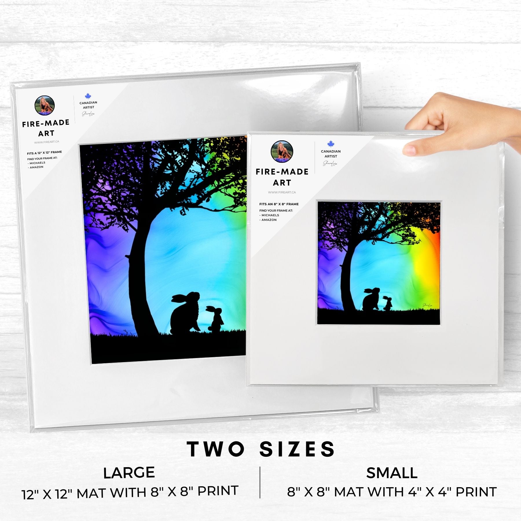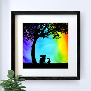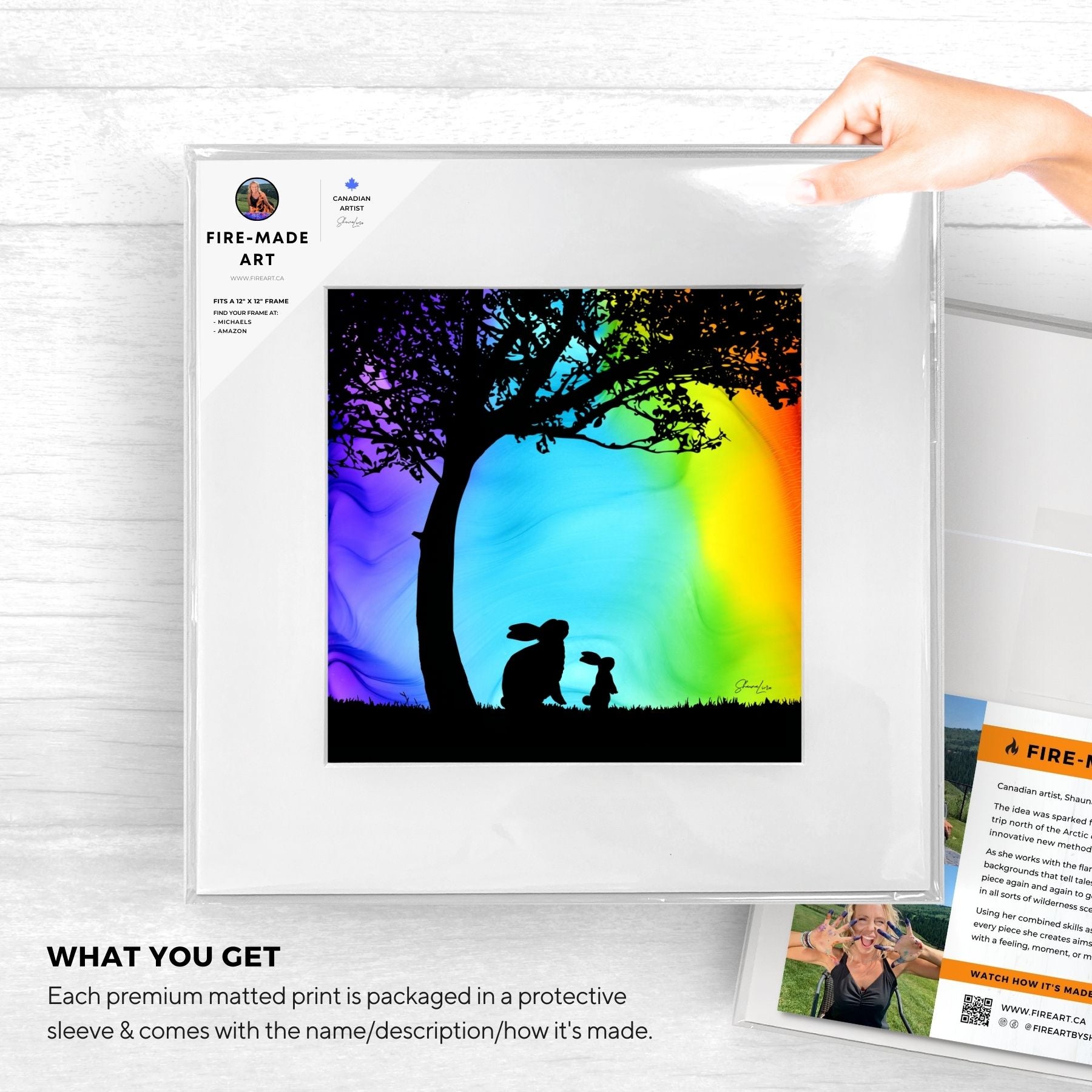 Beneath the sheltering arms of an ancient tree, a rabbit and its young one dream together, envisioning a future as bright and colorful as the sky above them. Created with fire and ink, this piece captures a world of possibility where dreams are as limitless as the rainbow hues that dance above these gentle creatures.