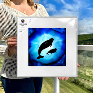 I can still feel the rocking of my canoe as hundreds of beluga whales surrounded me on day 28 of my paddling trip. This artwork, created with fire and ink, celebrates that magical moment and showcases these highly intelligent and sociable whales. These gentle giants navigate with their playful calls echoing through the icy landscape as they glide through northern seas with effortless grace.