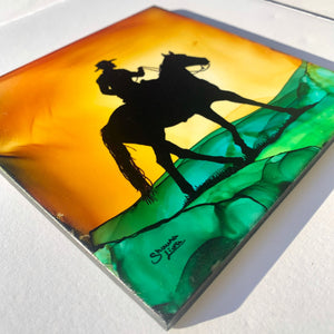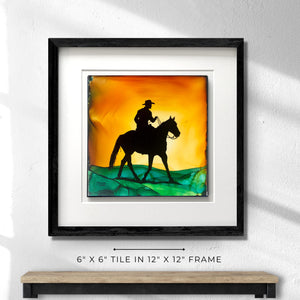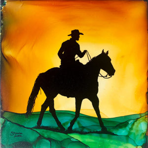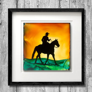 Eye-popping brilliance and stunning detail come to life with this original 'A Place To Roam' piece.  The golden aura that emerged from the fired ink inspired me to create this piece about living life free in the saddle- where a roaming rider returns in the soft, warm light of sunset.