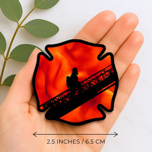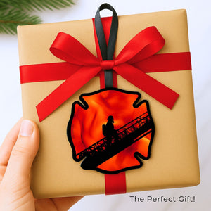The Story Behind This Piece: A firefighter ascends the Aerial amidst the background blaze on their way to rescue people from their only way out.  Created by fire and ink this moment speaks of the courageous work of those in fire and rescue.