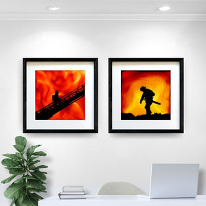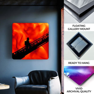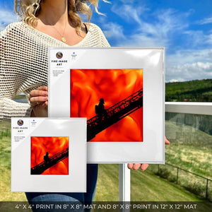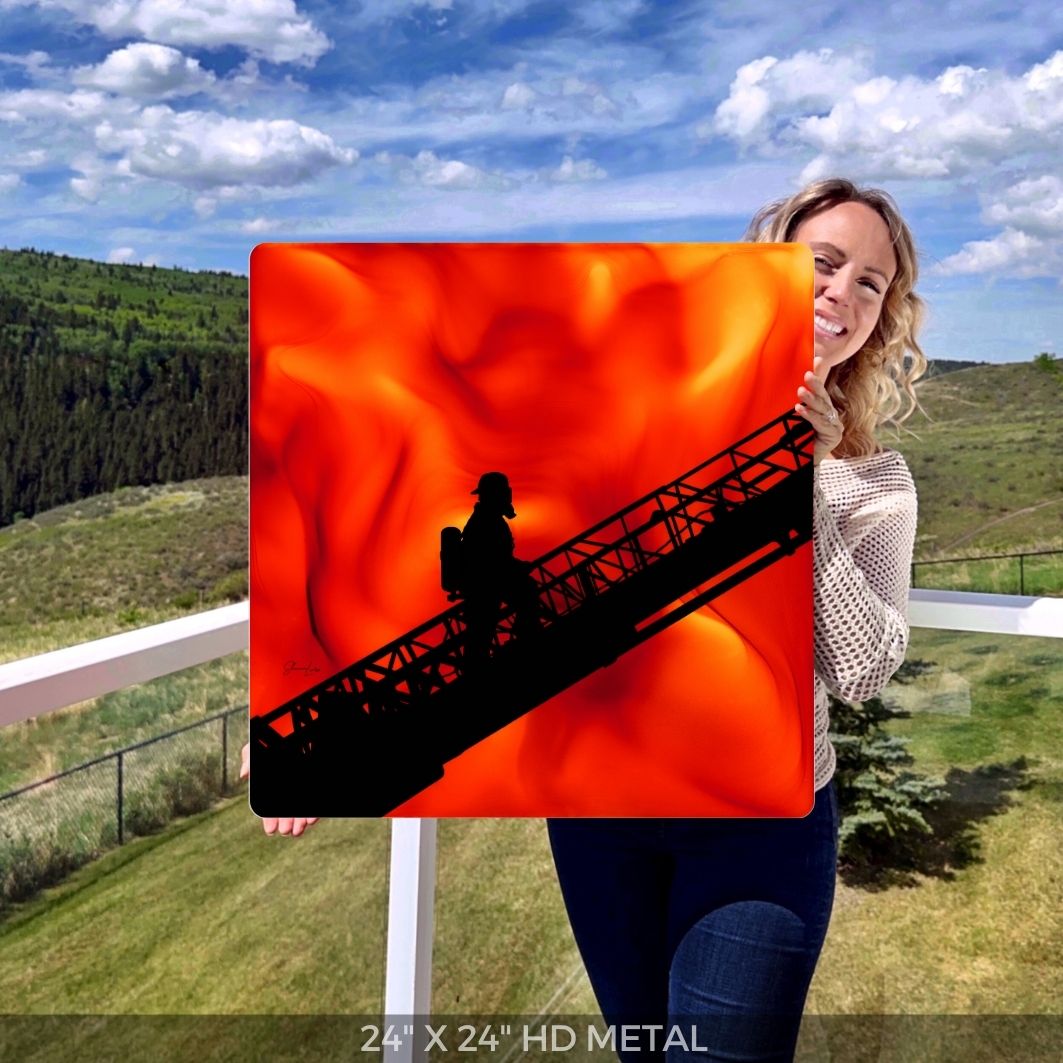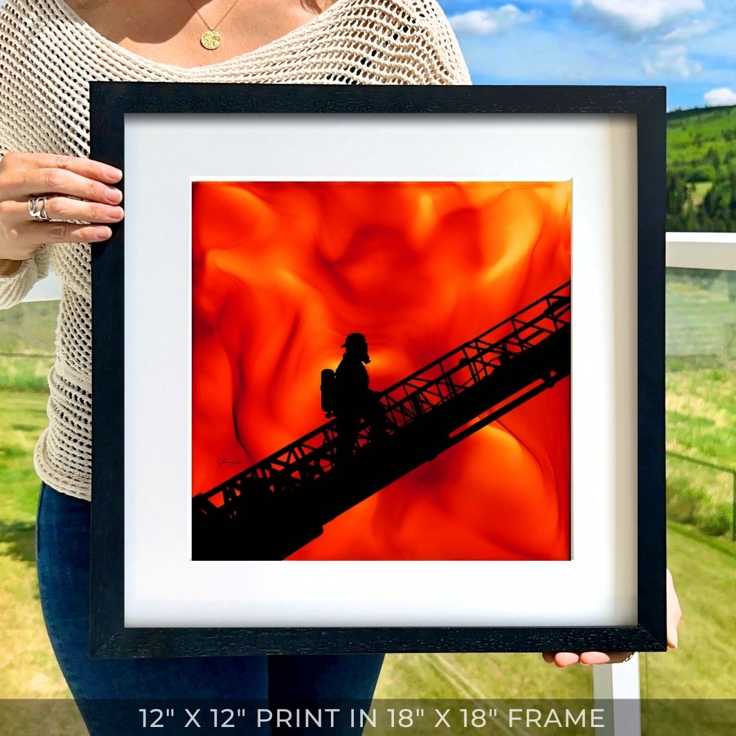 A firefighter ascends the Aerial amidst the background blaze on their way to rescue people from their only way out.  Created by fire and ink this moment speaks of the courageous work of those in fire and rescue.