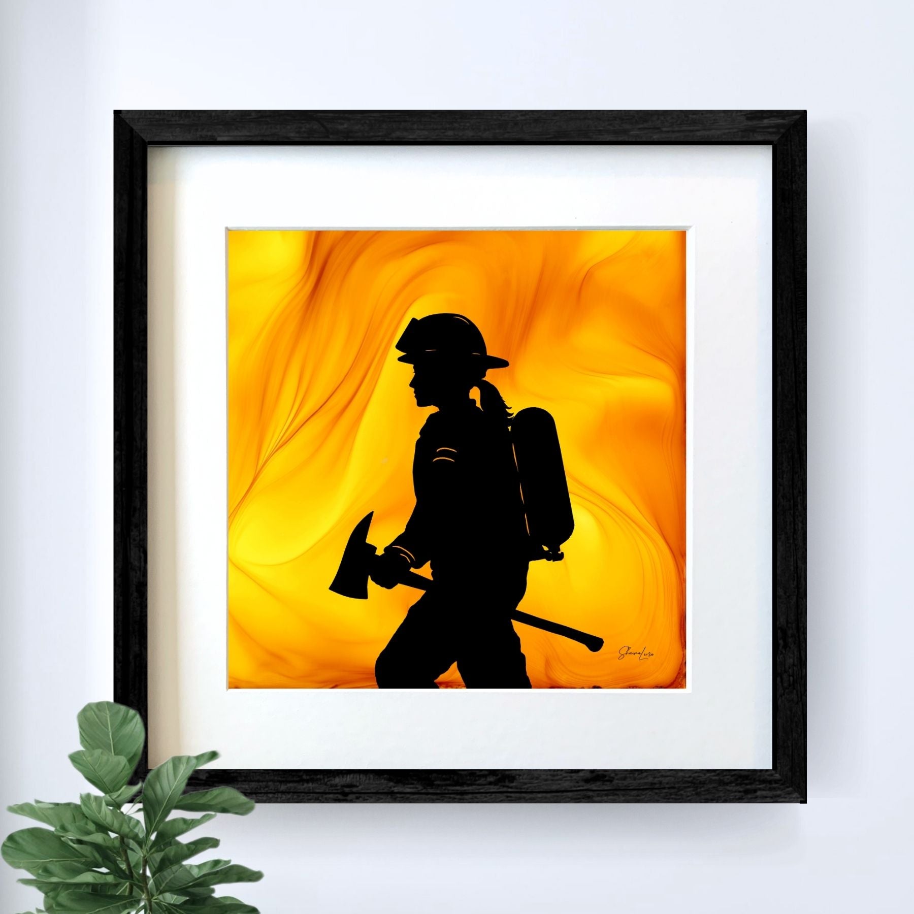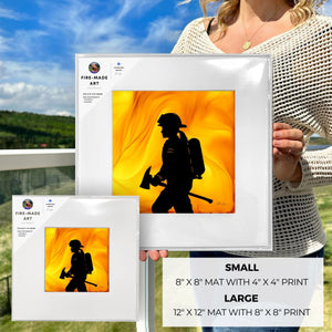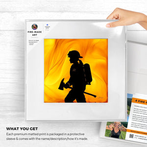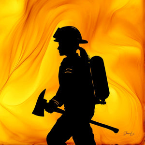 The swirling flames that emerged from the fire and ink create a powerful backdrop for the female firefighter driven by courage. Facing the task at hand, her strength and resilience shine through.