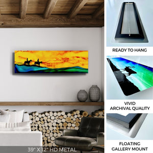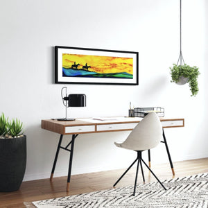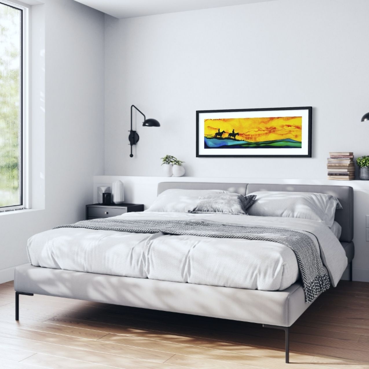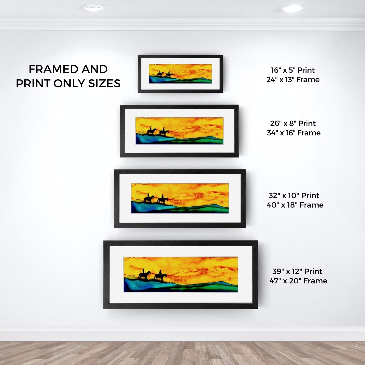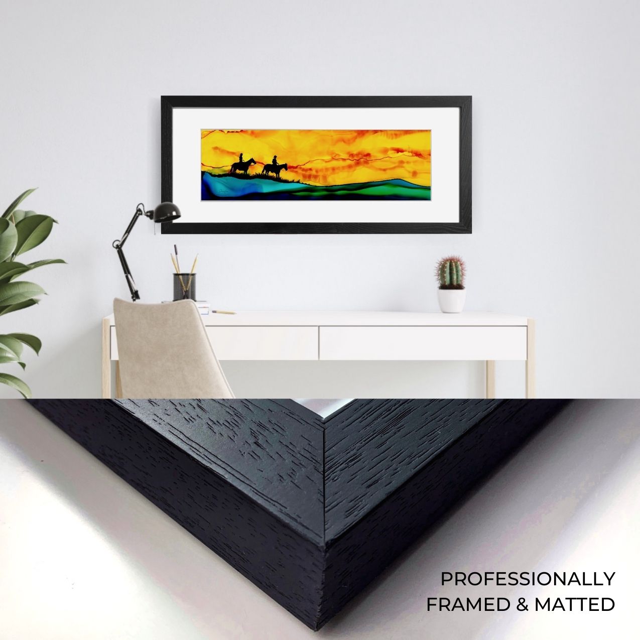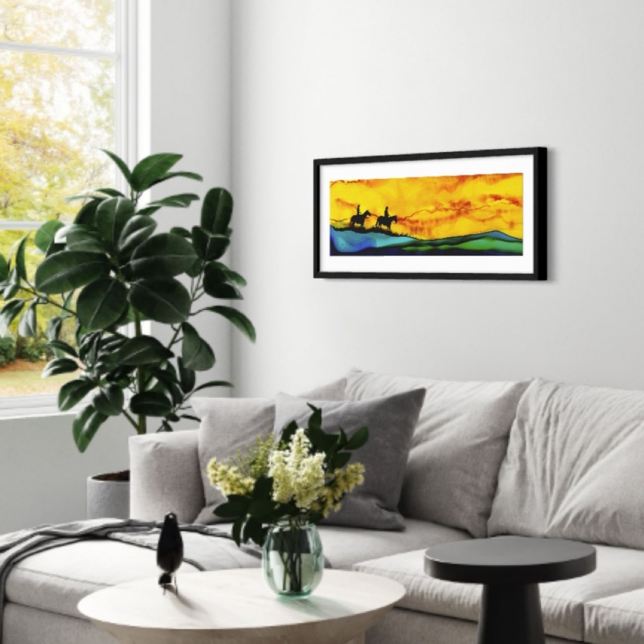 Two riders, silhouetted by sunset, take in the moment as they roam the land. I created this piece for those who follow their joy on horseback.