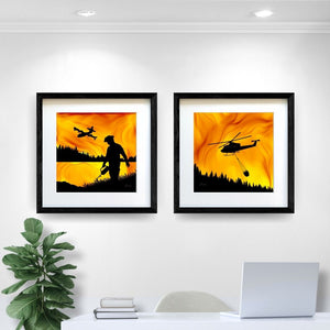 A wildland firefighter paints a line of defense with his drip torch in preparation for the roaring flames approaching. His decisive actions symbolize the thin line between devastation and salvation.  This artwork, created with the very fire he fights, speaks of the courage and dedication of those who stand guard over our treasured wildlands.
