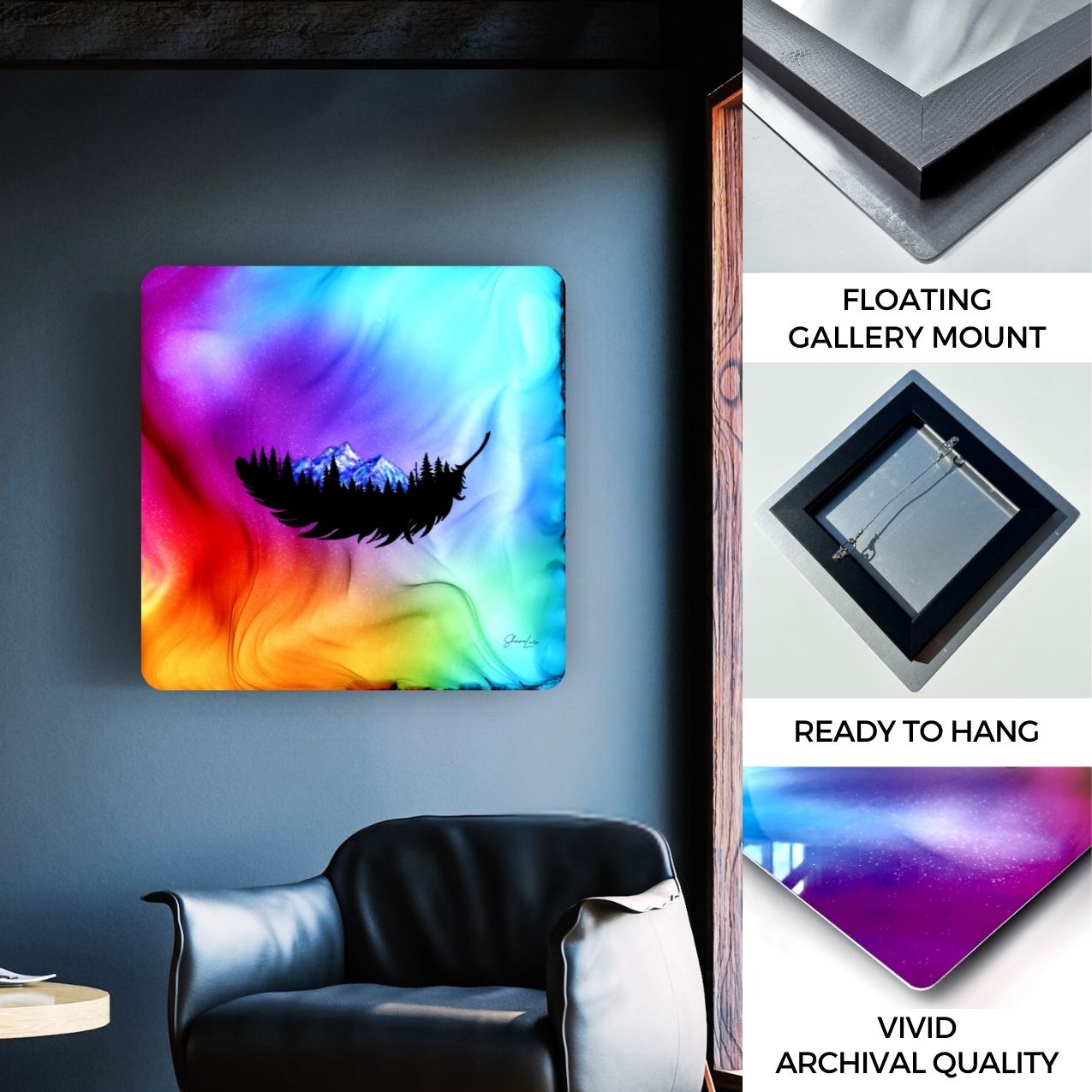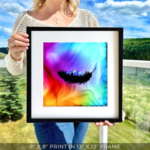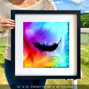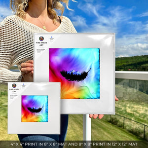 A feather, drifting with the breeze. I created this piece for those who wish to catch the wind and soar to new heights. The vibrant colors and movement of the fire and ink speak to the freedom I lose myself in when exploring wild places.