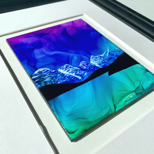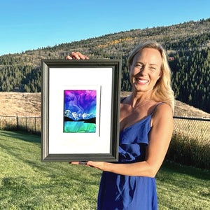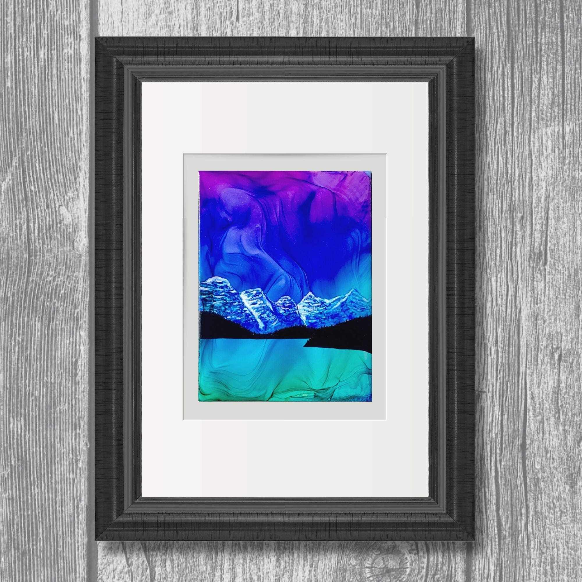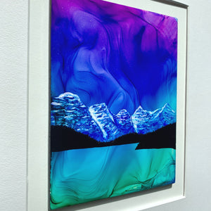 There is beauty in stillness.  Like waters clear as glass on a windless night, the tones captured by the fire and ink capture the magic of Morraine Lake and its turquoise waters under skies filled with northern lights. Brilliant and stunning detail come to life with this original 'Glory Of Morraine' piece.