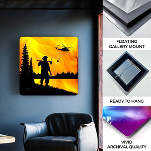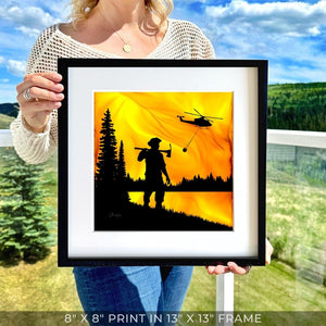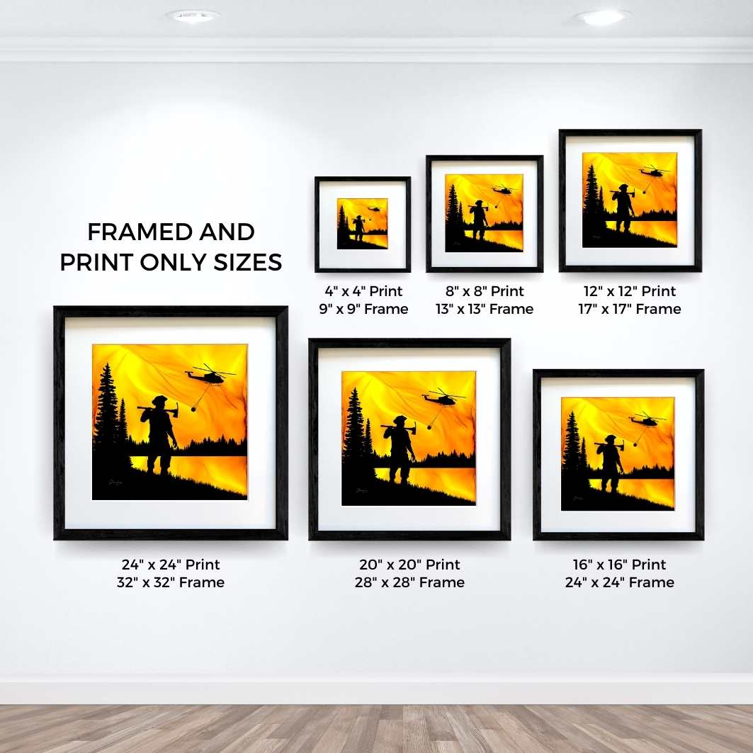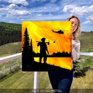 As swirling flames approach a wildland firefighter, a helicopter carries hope with a helibucket filled with water.  Grounded in purpose, these guardians are fueled by a deep-rooted love for the land they serve. This piece, forged by the very flames they combat, captures the spirit of those who dare to face the fire, showcasing the intricate balance of strength and strategy essential for wildland fire containment.