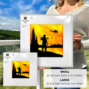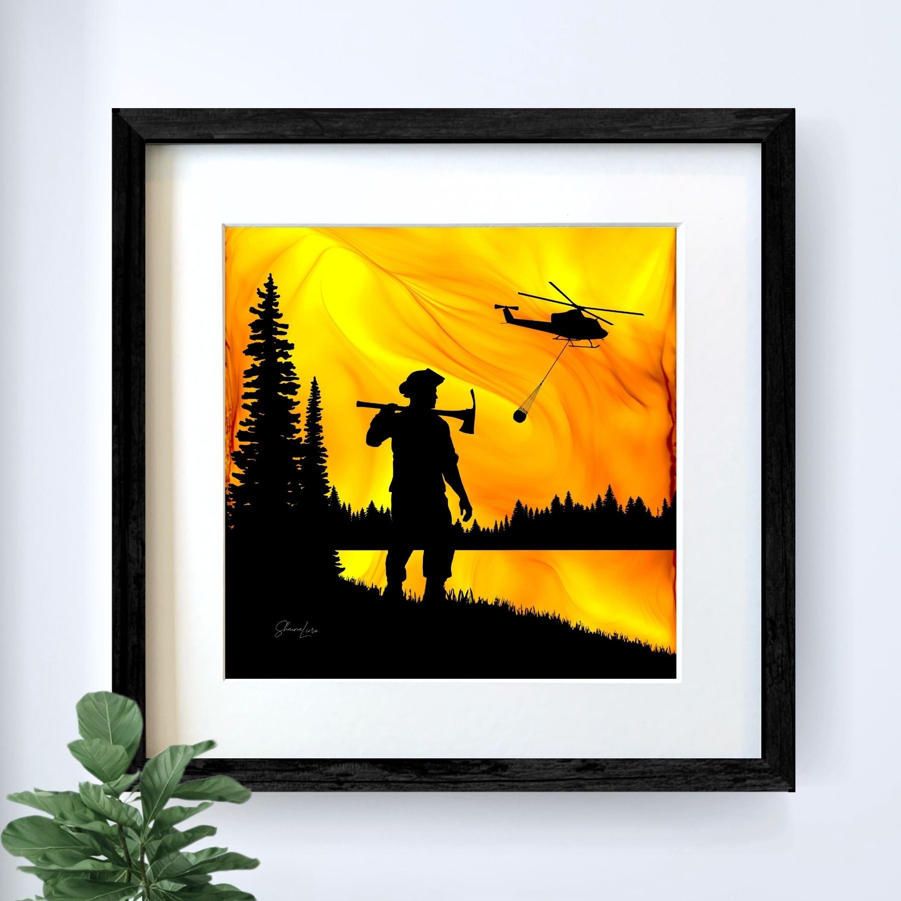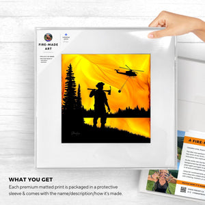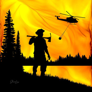 As swirling flames approach a wildland firefighter, a helicopter carries hope with a helibucket filled with water.  Grounded in purpose, these guardians are fueled by a deep-rooted love for the land they serve. This piece, forged by the very flames they combat, captures the spirit of those who dare to face the fire, showcasing the intricate balance of strength and strategy essential for wildland fire containment.