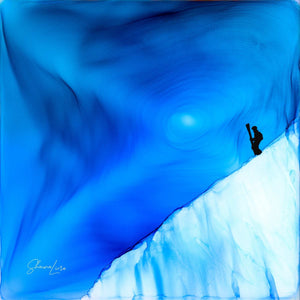 Fire, ink, sky, and snow... these simple elements combine to form a piece that captures a singular experience- that beautiful moment of calm before you let go, and drop in.