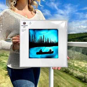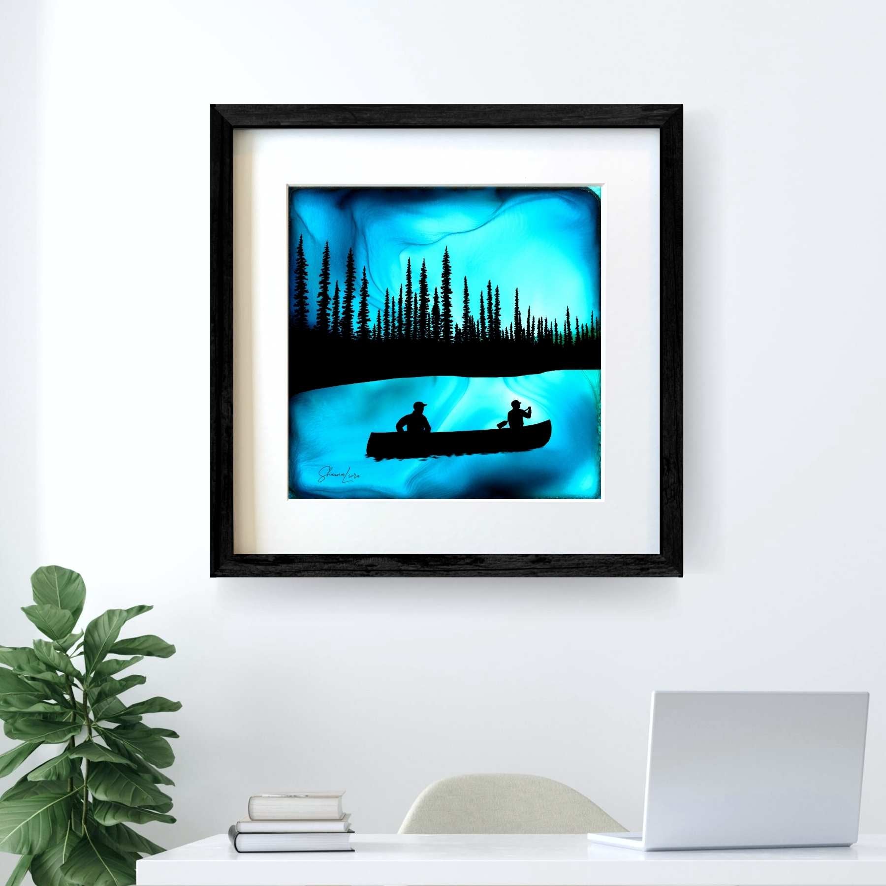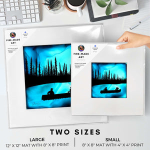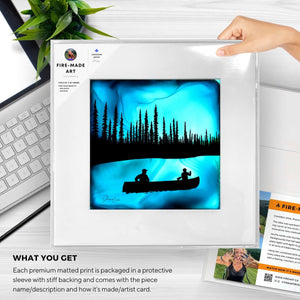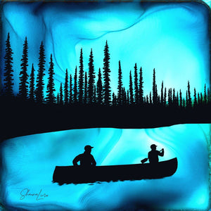 I have a deep passion and love for exploring the remote corners of Canada by canoe. The moonlight hues of the fire and ink reflect the feeling and calm that's attained during these northern journeys- that amalgamation with raw wilderness as you paddle along an endless boreal shoreline over clean, clear, and glassy waters.
