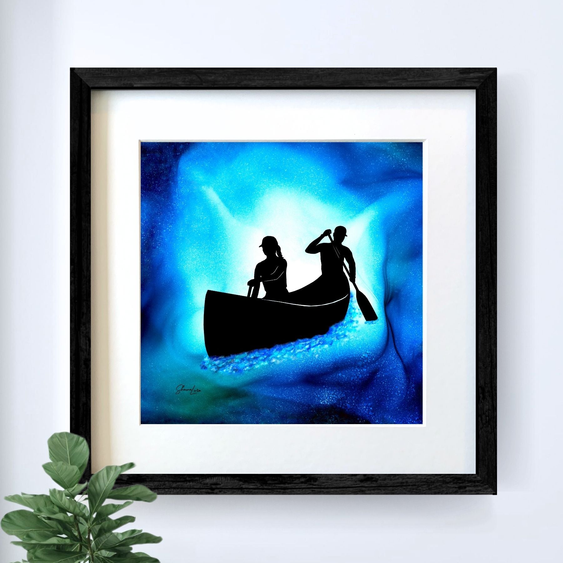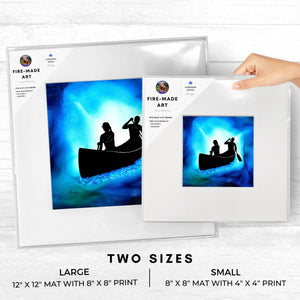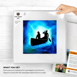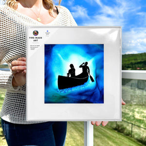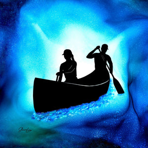 The thrill of the unknown calls as the canoe cuts through the water. Every paddle stroke invites memories of stepping into a new adventure. Created with fire and ink, this artwork symbolize the courage, resilience, and beauty found on the other side of hardship and transformation as well as celebrating those cherished moments of discovery in wild places.