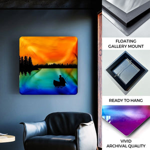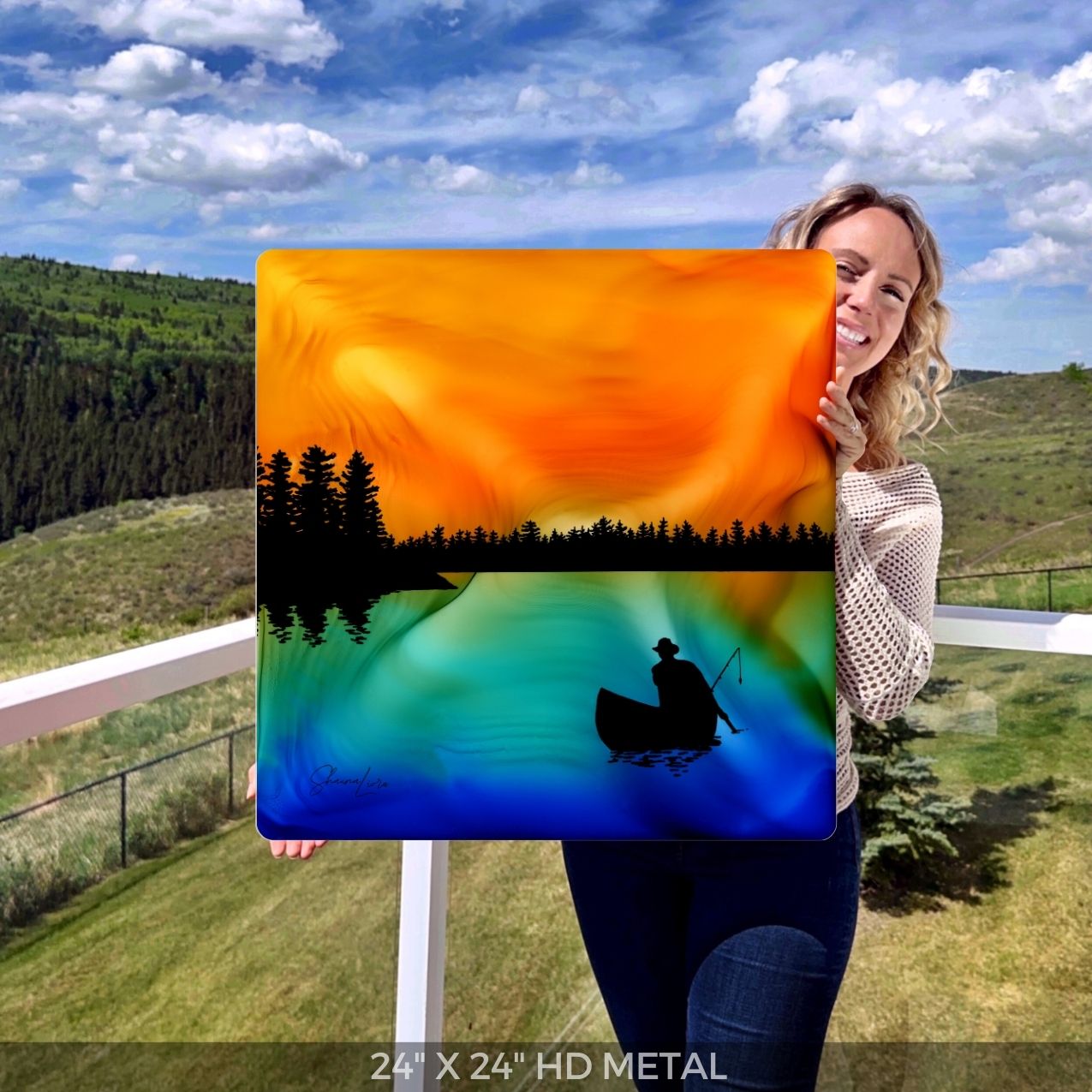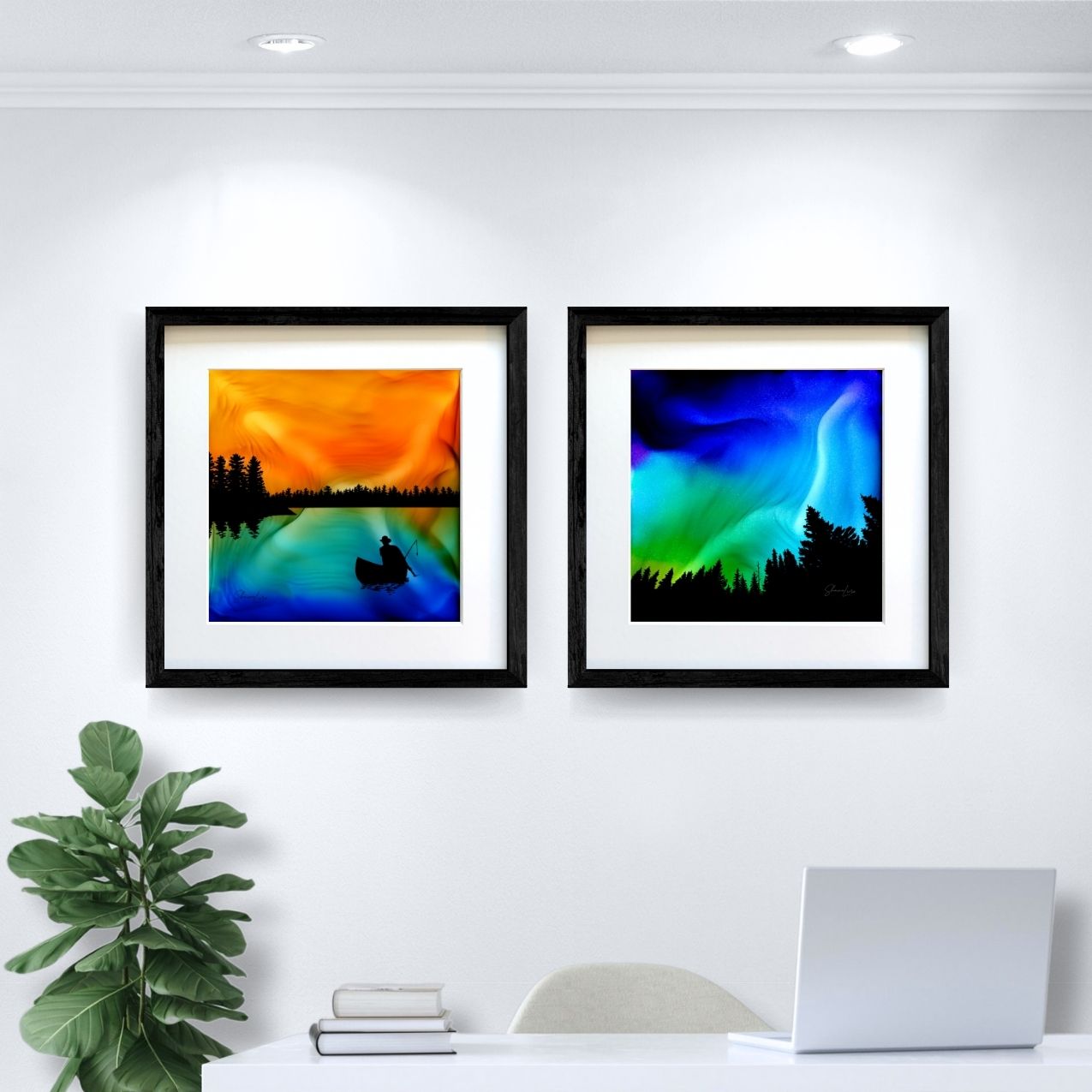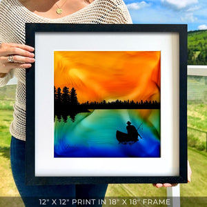 Warm skies and calm water crystallized out of the ink burning process, setting the scene for a sunset paddle. A peaceful and serene moment, I was inspired to meld the lone canoeist into the piece from a moment I had watching my father glide into an evening on Lake Nippissing.