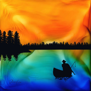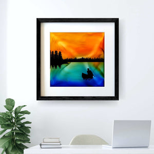 Warm skies and calm water crystallized out of the ink-burning process, setting the scene for a sunset paddle. A peaceful and serene moment, I was inspired to meld the lone canoeist into the piece from a moment I had watching my father glide into an evening on Lake Nippissing.