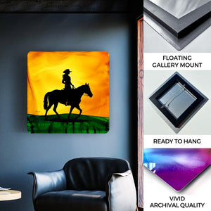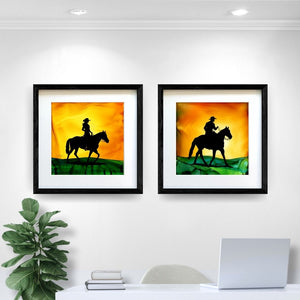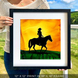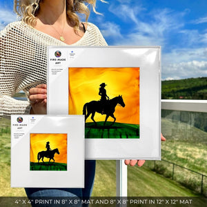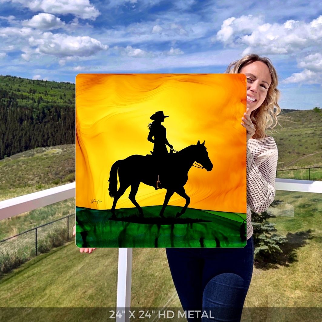 Riding in perfect harmony, a cowgirl and her horse explore together.  Created with fire and ink, this piece captures their shared spirit of adventure and the joy of journeying through open lands. This is the beauty of a life shared on horseback.