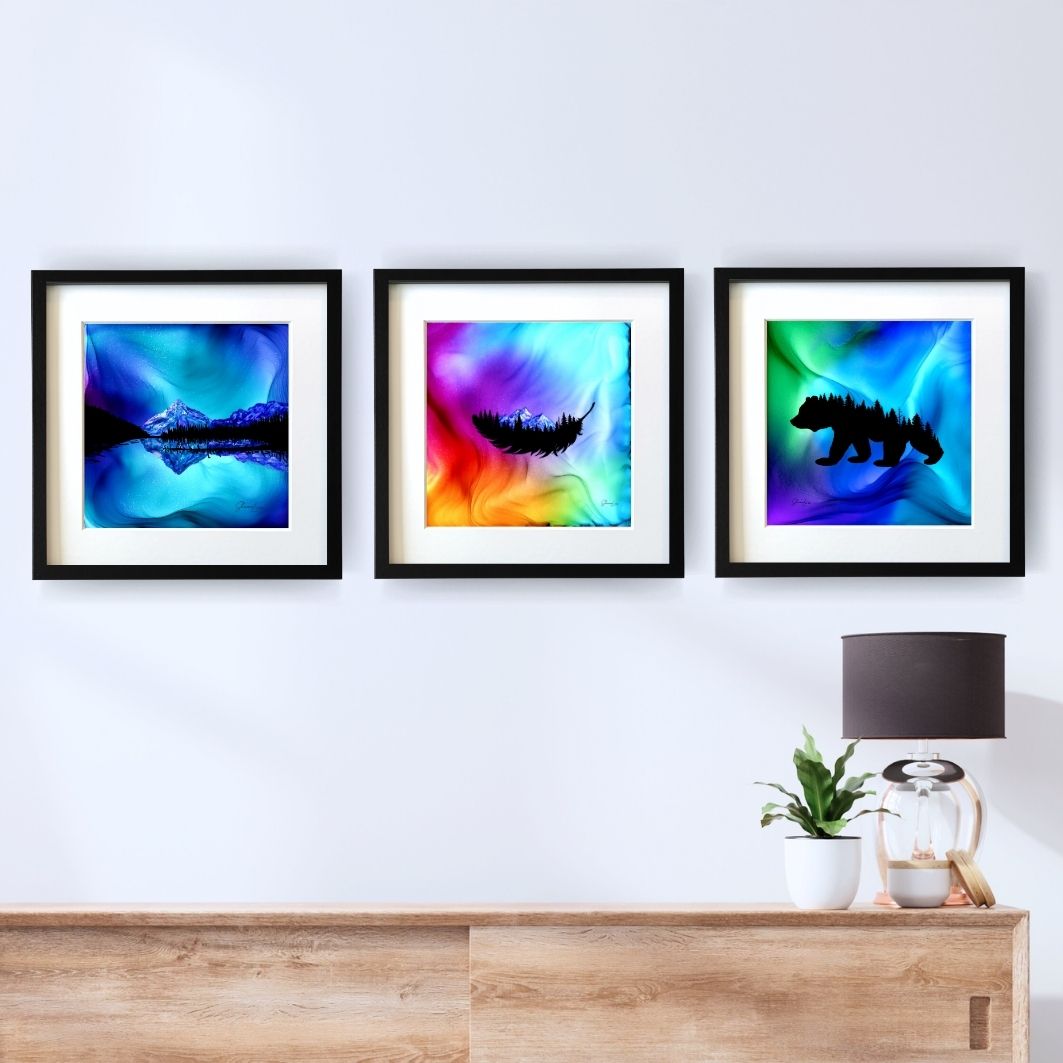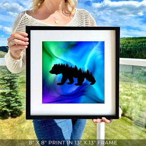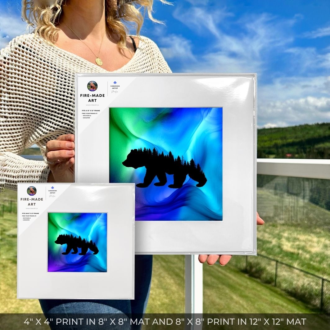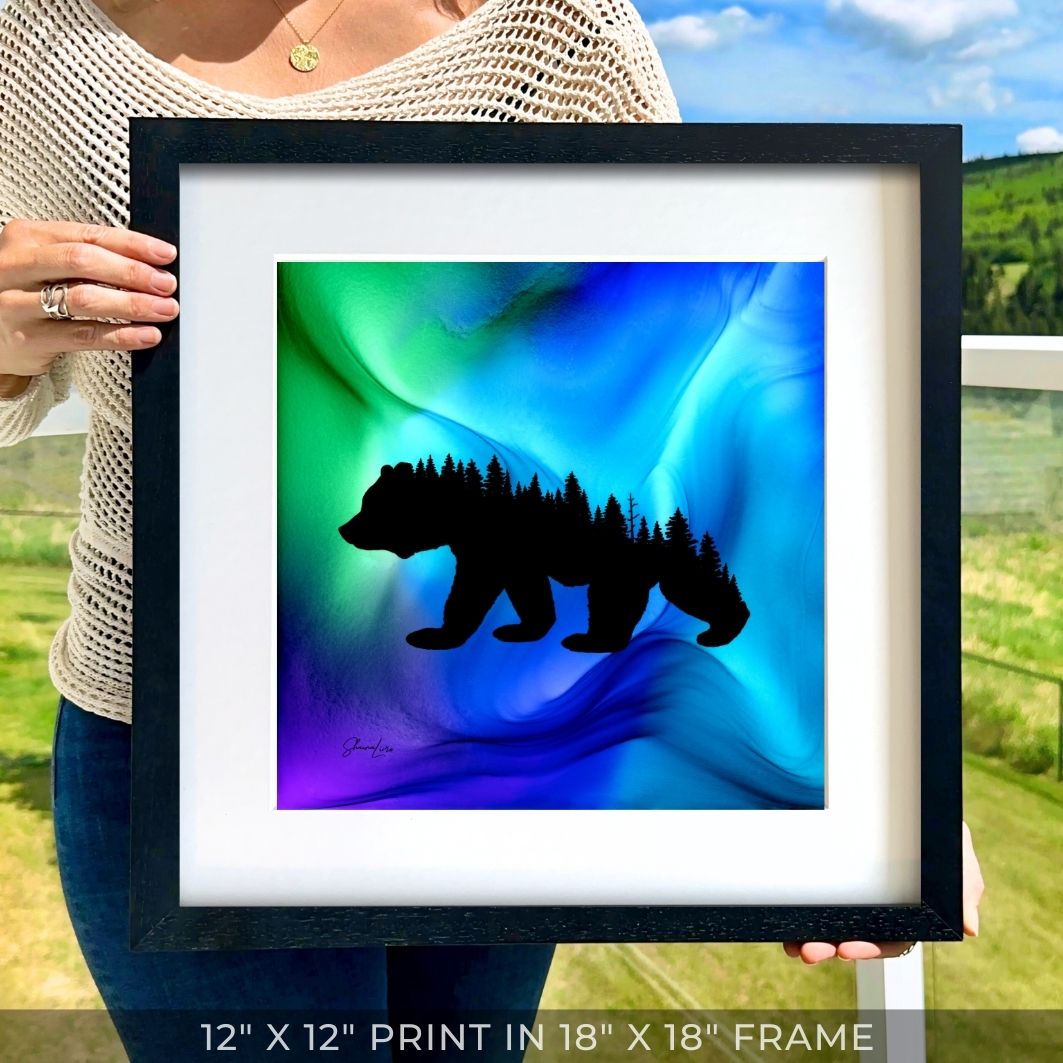 There is something magical in this piece for me.  The mesmerizing swirls and movement of the fire and ink form the serene backdrop for a roaming bear, blended with its forest home. The wildness and wonders of nature call me to explore its lost whispers again and again.