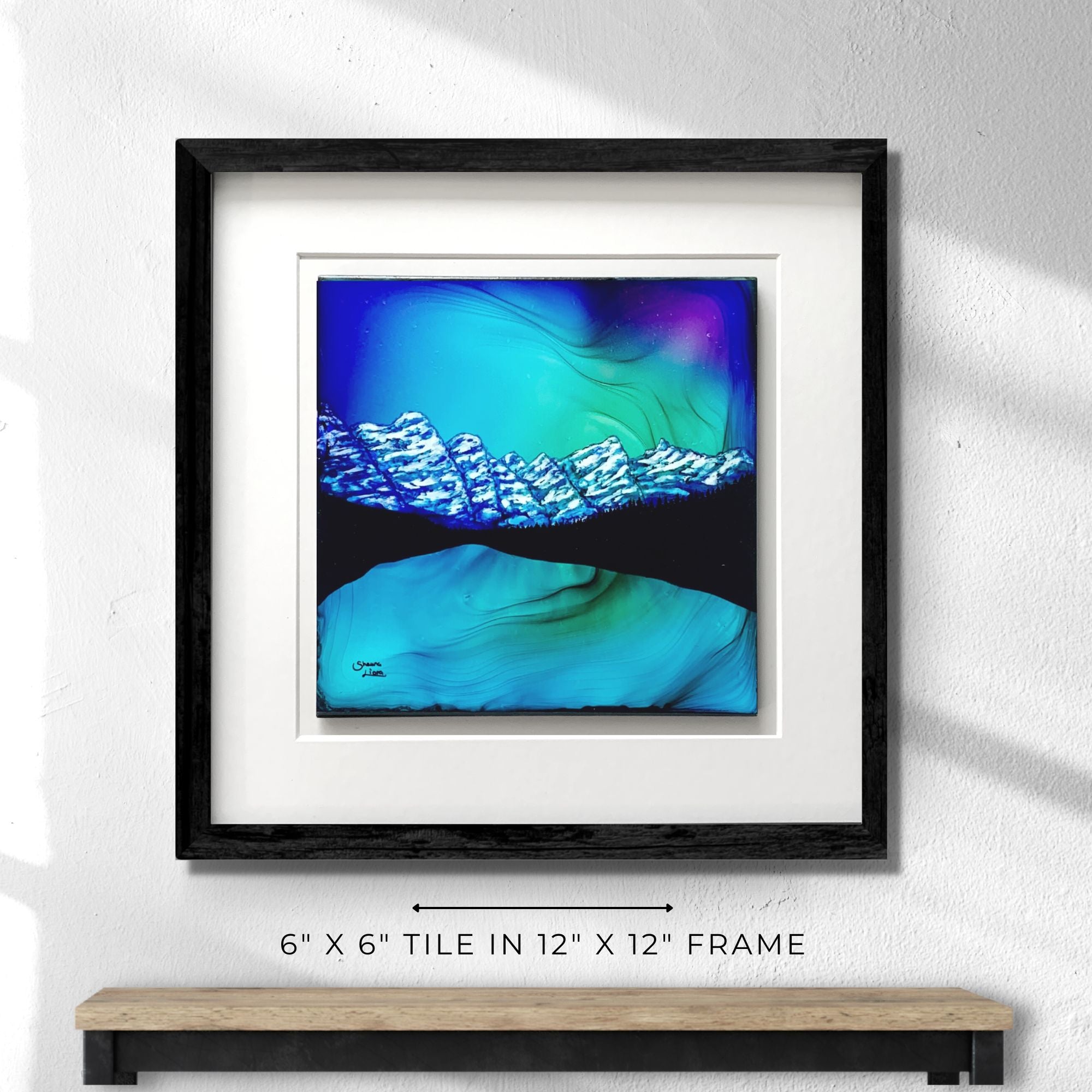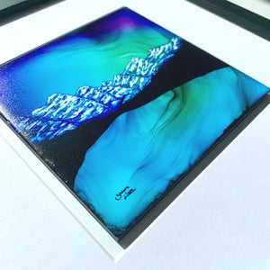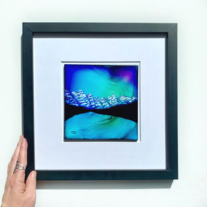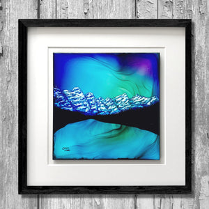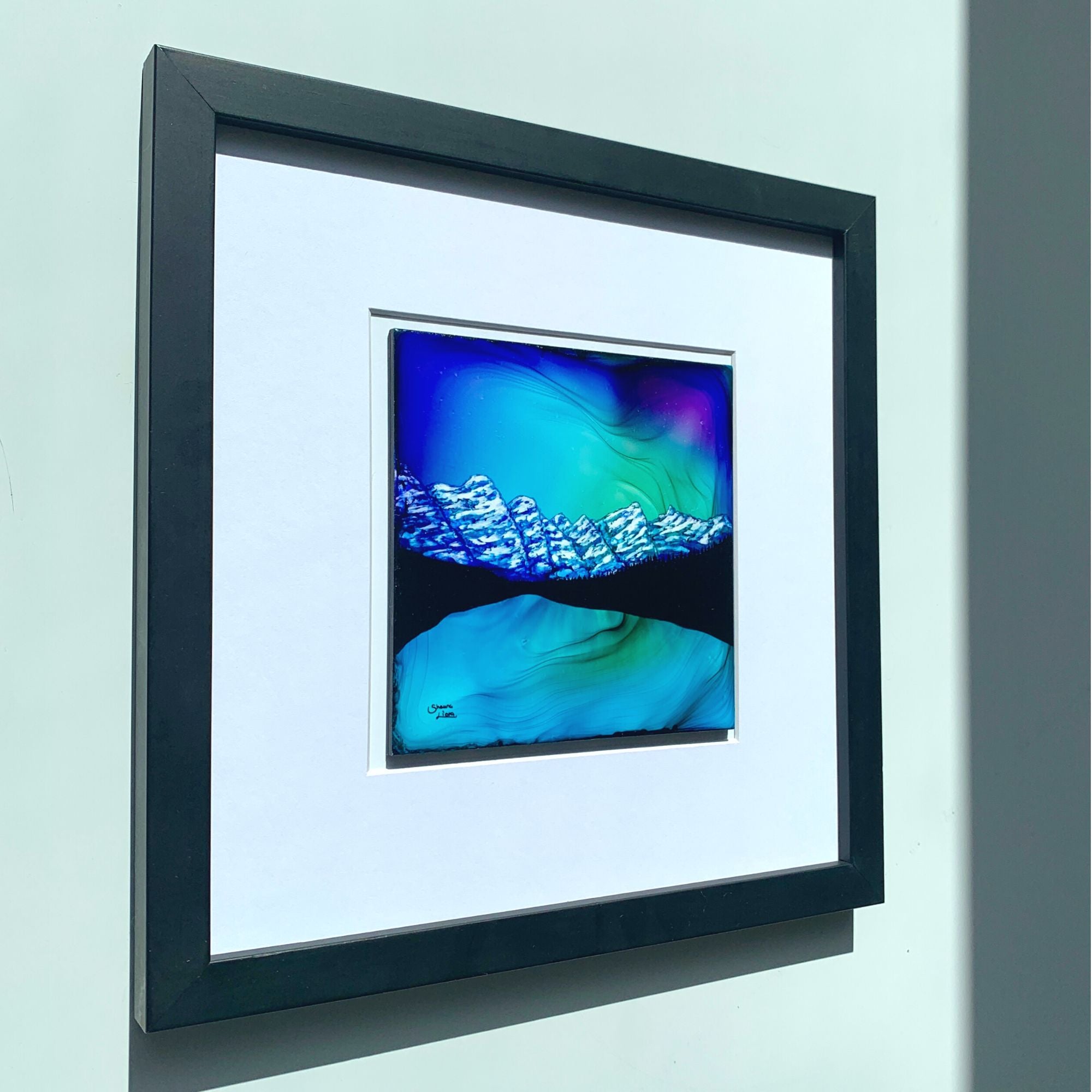 The peaks surrounding the waters of Morraine Lake reach for the sky in this iconic mountain scene in Banff National Park. The swirls and colours made by the fire and ink help to capture the beauty of this magical place. Brilliance and stunning detail come to life with this original 'Magic Of Morraine' piece.