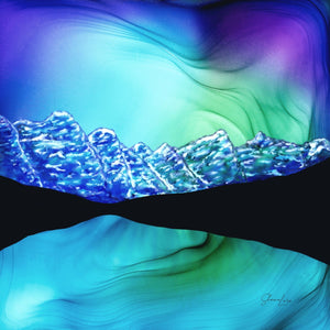 The peaks surrounding the waters of Morraine Lake reach for the sky in this iconic mountain scene in Banff National Park. The swirls and colours made by the fire and ink help to capture the beauty of this magical place.