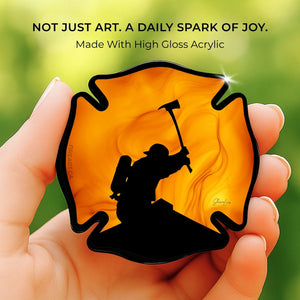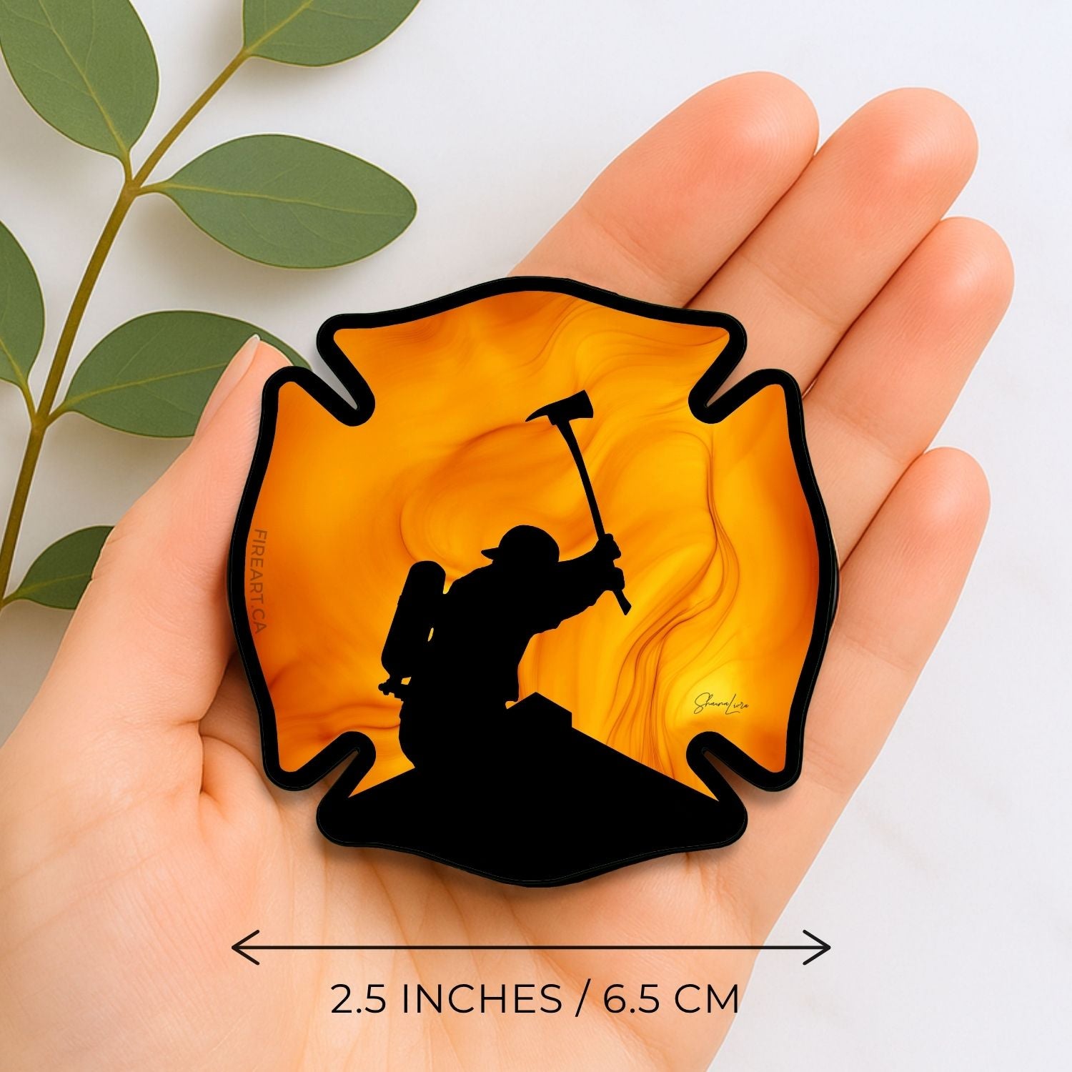 About This Piece:  A firefighter breaches the roof to release the superheated gasses providing a stable environment for the team to enter below. His hard work and training have earned him this moment. The lifelike flames created by the fire and ink highlight the intense scene as the fire vents from the roof's peak.