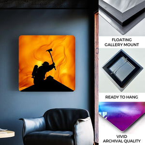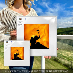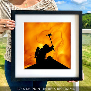 A firefighter breaches the roof to release the superheated gasses providing a stable environment for the team to enter below. His hard work and training have earned him this moment. The lifelike flames created by the fire and ink highlight the intense scene as the fire vents from the roof's peak.