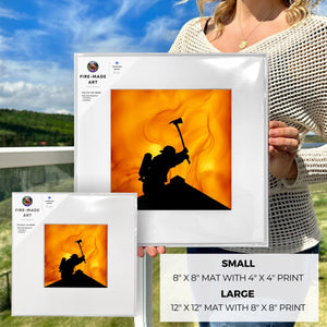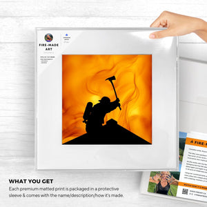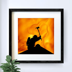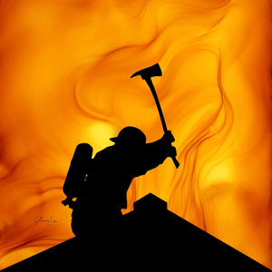A firefighter breaches the roof to release the superheated gasses providing a stable environment for the team to enter below. His hard work and training have earned him this moment. The lifelike flames created by the fire and ink highlight the intense scene as the fire vents from the roof's peak.