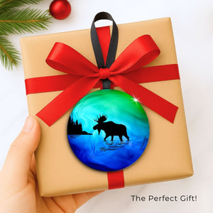 About This Piece:  Emerging from the morning mist, a solitary moose crosses the calm waters under the ethereal swirls of emerald skies. Created with fire and ink, this piece captures a moment suspended in time inviting you on a journey into the heart of nature.