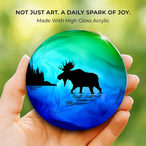 The Story Behind This Piece: Emerging from the morning mist, a solitary moose crosses the calm waters under the ethereal swirls of emerald skies. Created with fire and ink, this piece captures a moment suspended in time inviting you on a journey into the heart of nature.