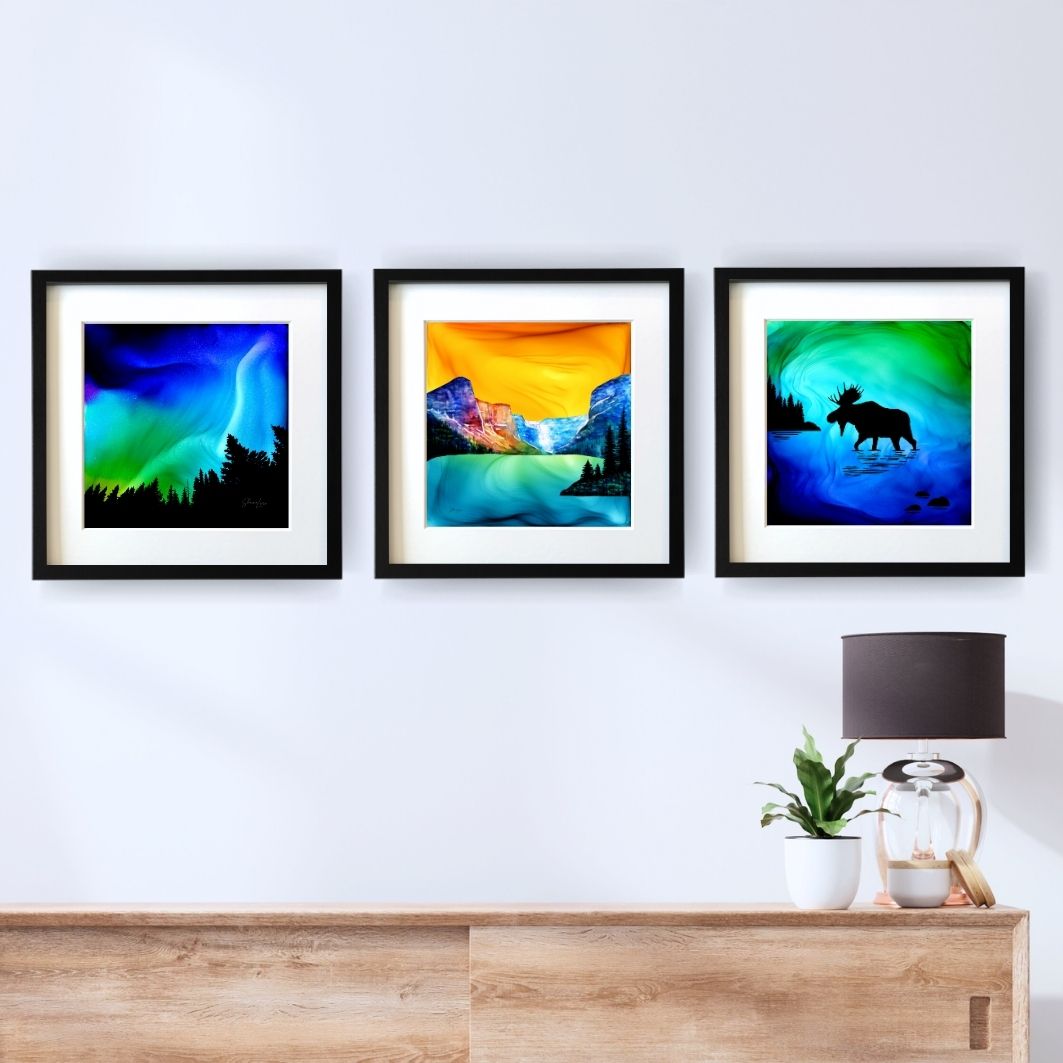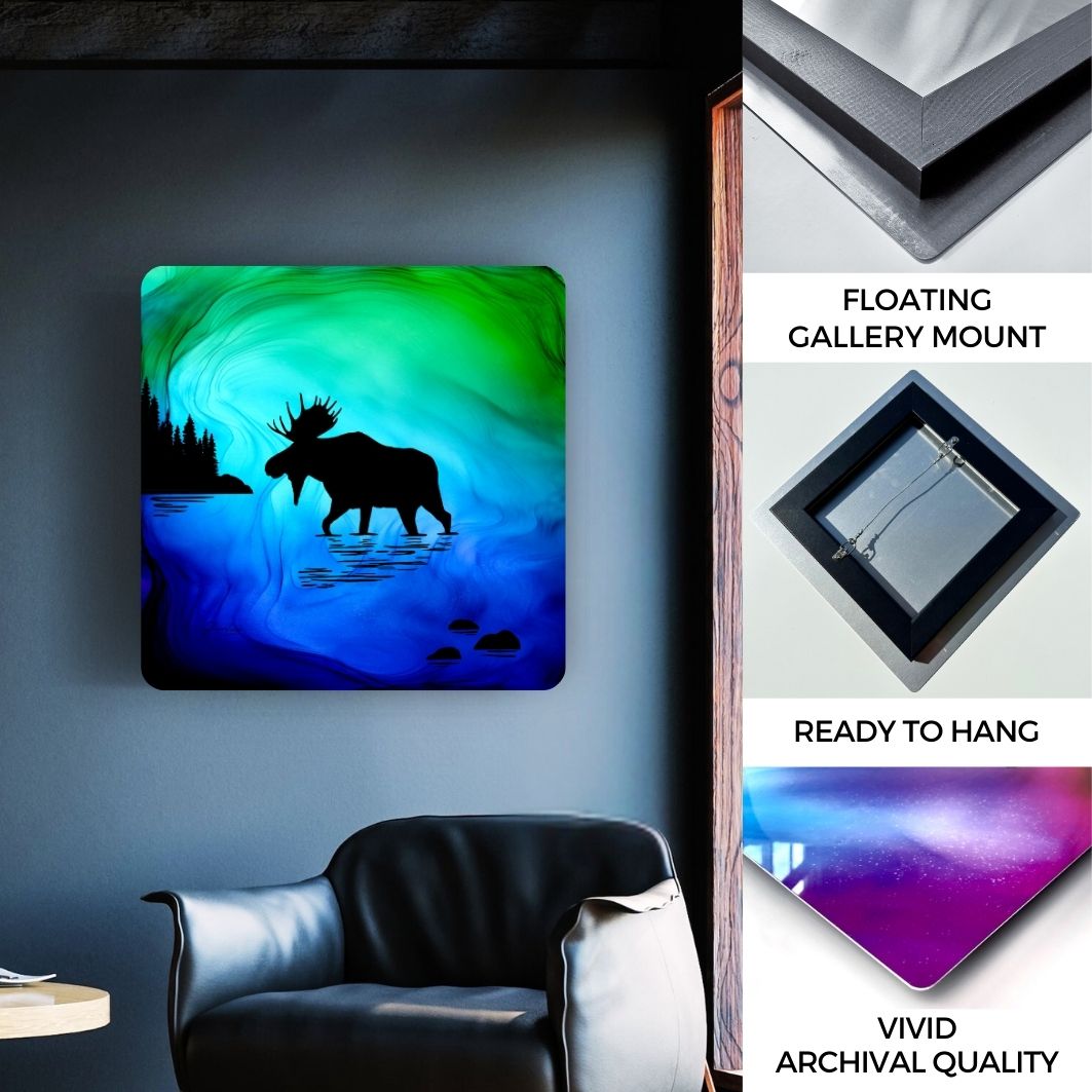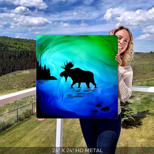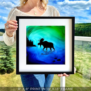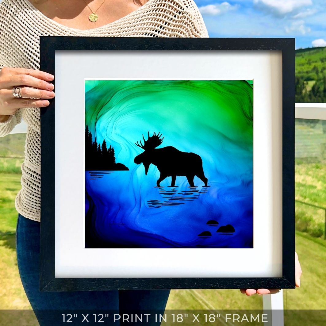 Emerging from the morning mist, a solitary moose crosses the calm waters under the ethereal swirls of emerald skies. Created with fire and ink, this piece captures a moment suspended in time inviting you on a journey into the heart of nature.