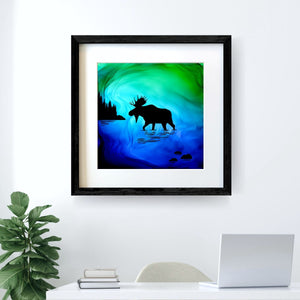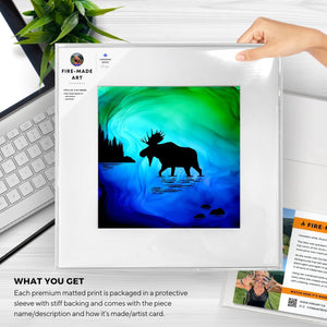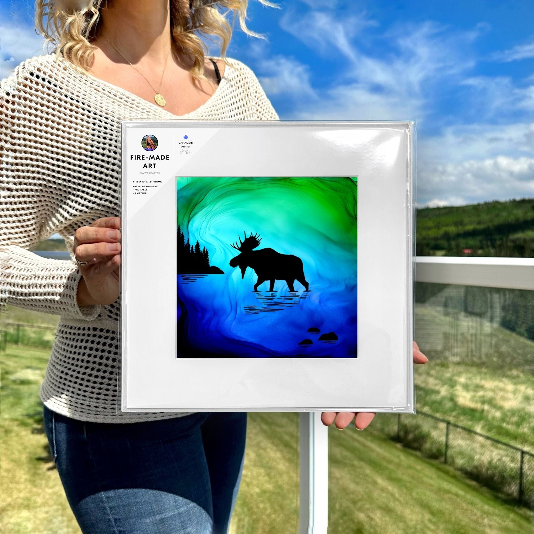 Emerging from the morning mist, a solitary moose crosses the calm waters under the ethereal swirls of emerald skies. Created with fire and ink, this piece captures a moment suspended in time inviting you on a journey into the heart of nature.
