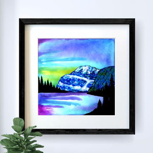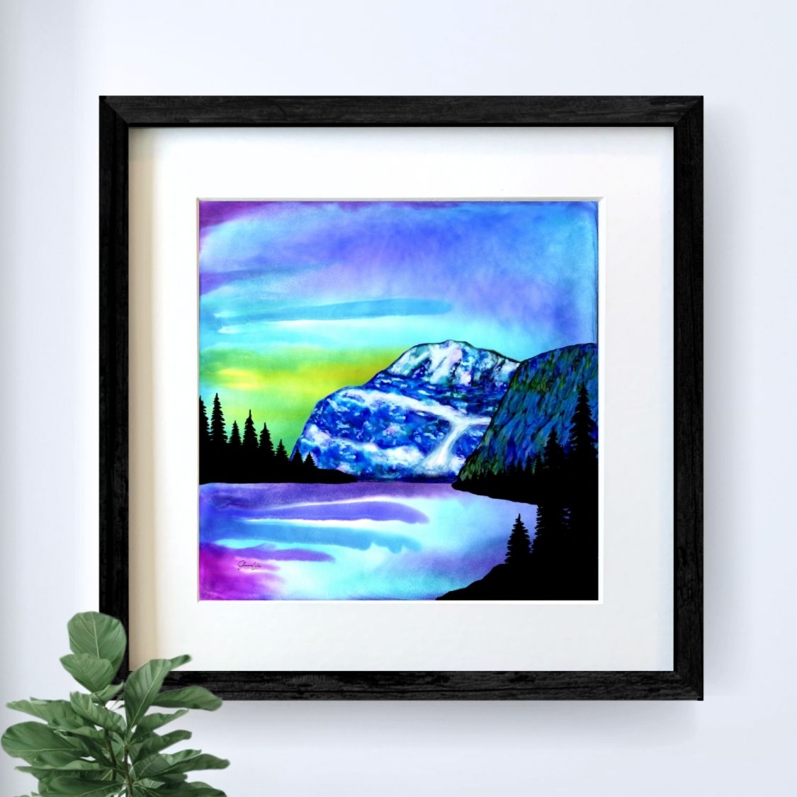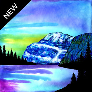 A symbol of the wild beauty of Jasper National Park, Mount Edith Cavell rises proudly while Angel Glacier spreads its wing-like form across the mountain’s face. Created with fire and ink, the piece features soft bands of color that mirror the way light skims across the lake’s surface at twilight—evoking the profound joy and wonder felt by all who witness this iconic peak.