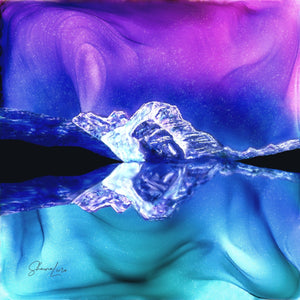 Reflected in Berg lake, magnificent Mount Robson rises above the forest, its summit hidden in shrouds of white. The movement of the fire and ink around this iconic peak exemplifies the energy and power it exudes.
