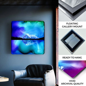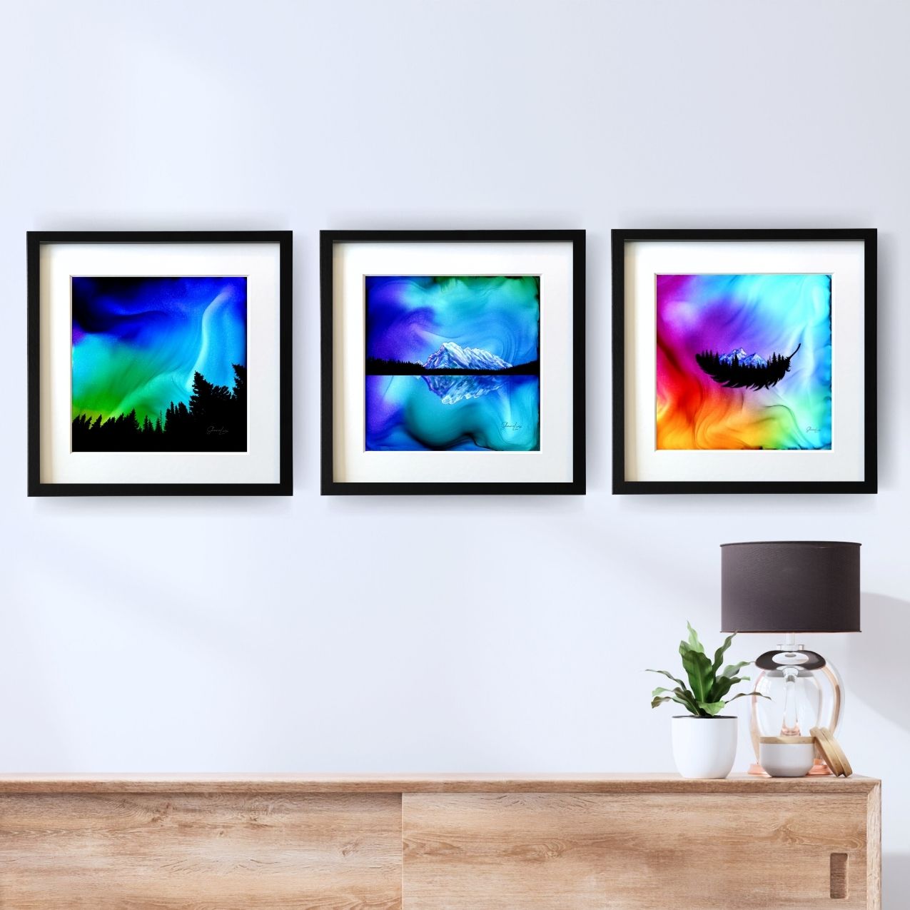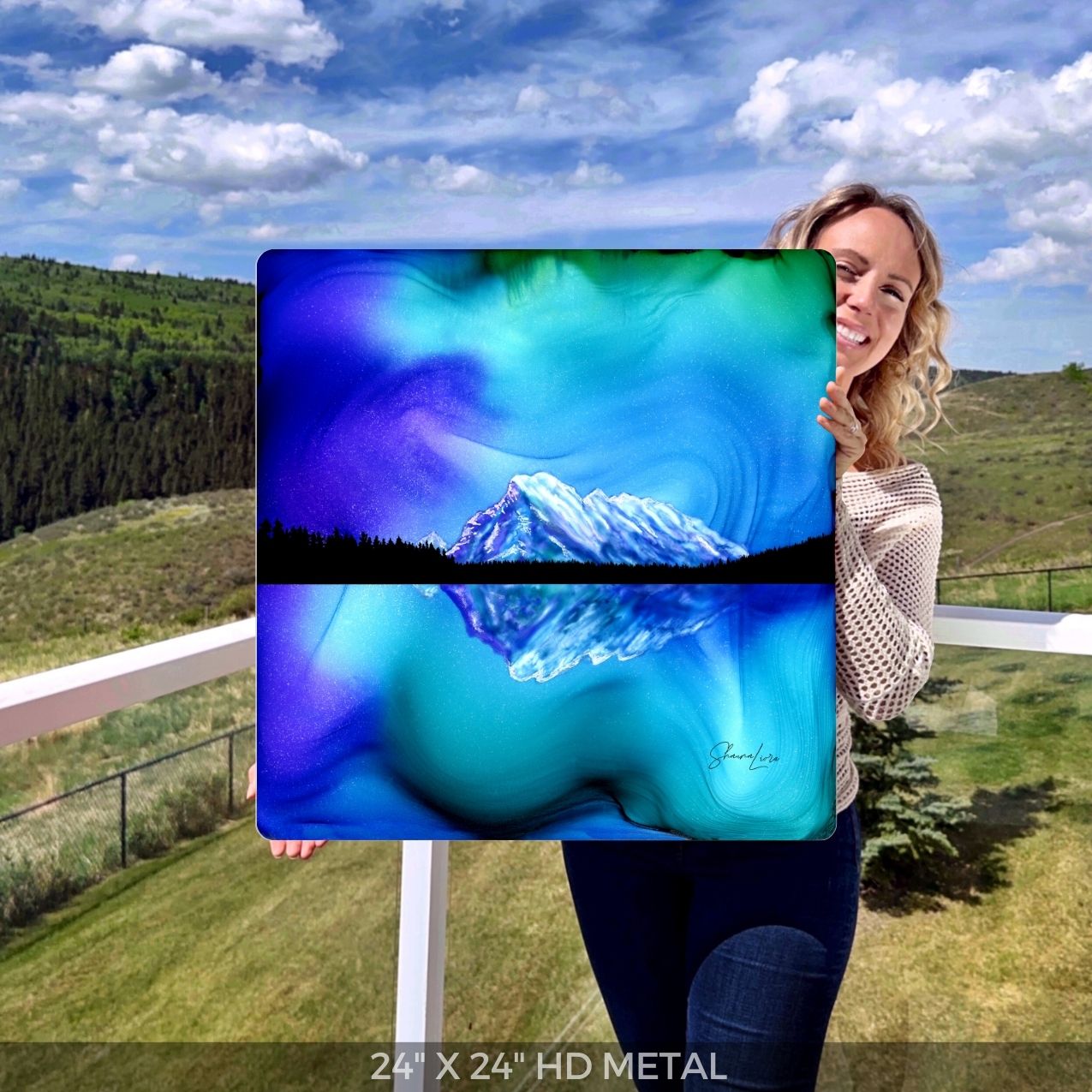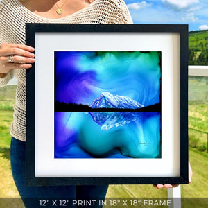 There is beauty in stillness. The dappled waters and moody sky created by the fire and ink stunningly reflect Mount Rundle in Banff National Park. Having witnessed many sunrises and sunsets in this place,  I created this piece to capture those moments.