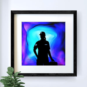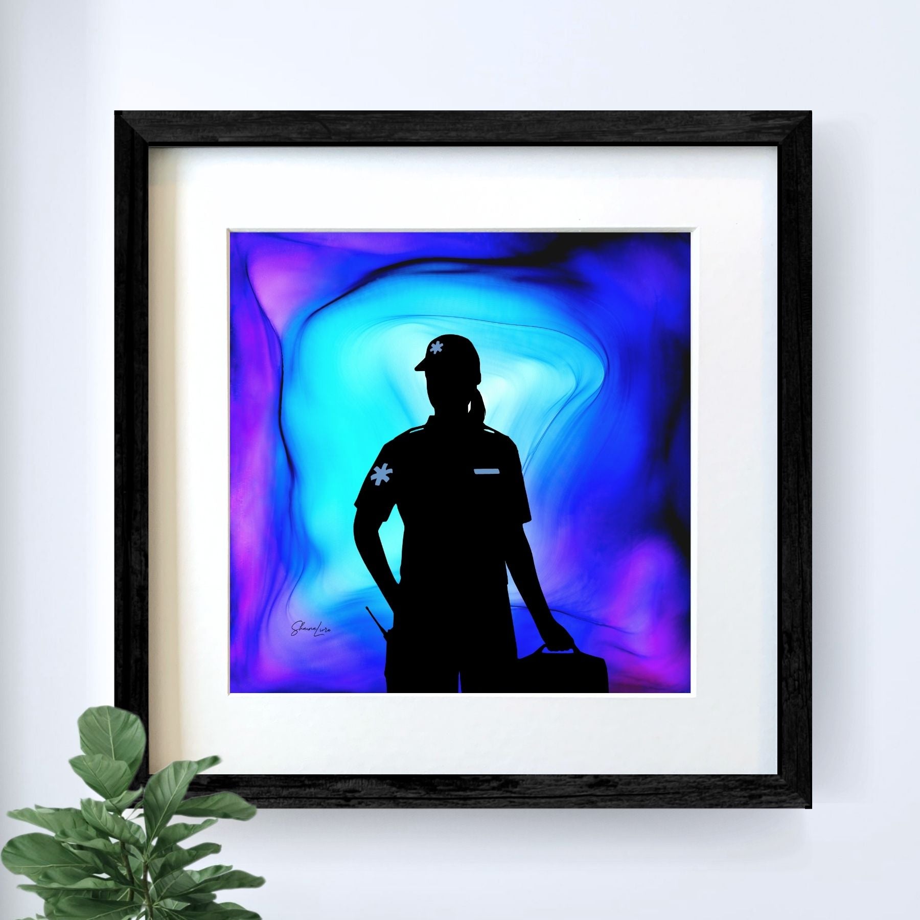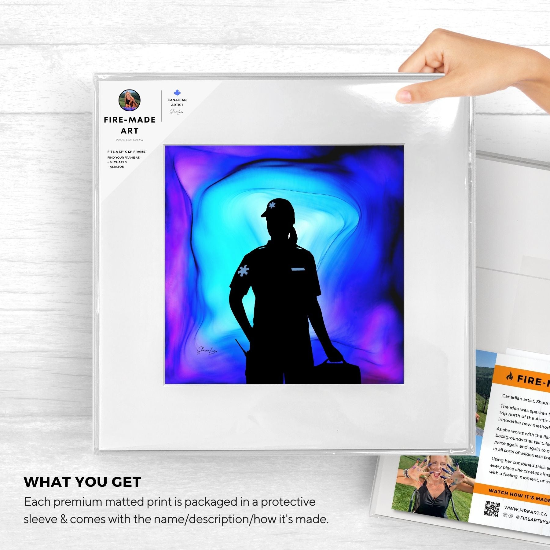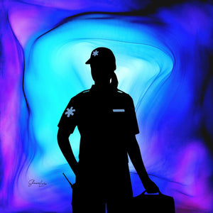 With a compassionate hand and calm presence, a female first responder provides care to those in their most vulnerable moments. The serene hues created by the fire and ink embody the hope that paramedics and EMTs bring to a desperate situation.