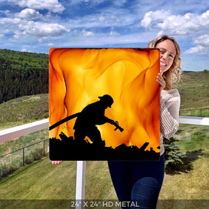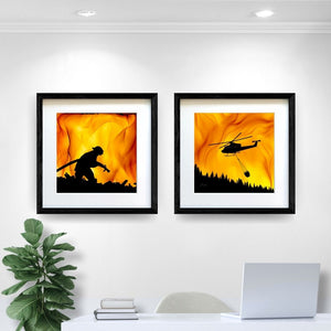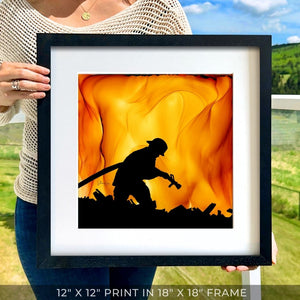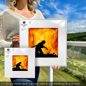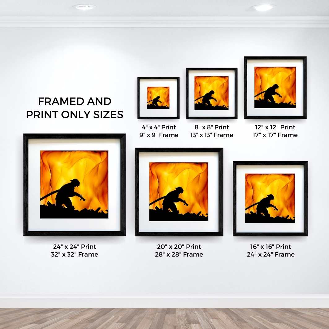 Sifting through the rubble and searching out hot spots, a firefighter closes in on the final flames. This piece, made with the very fire they battle every day, celebrates the courage of these hard-working, dedicated professionals.