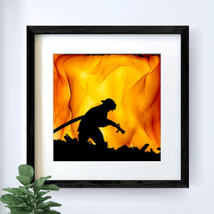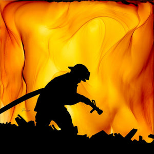Sifting through the rubble and searching out hot spots, a firefighter closes in on the final flames. This piece, made with the very fire they battle every day, celebrates the courage of these hard-working, dedicated professionals.