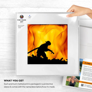 The artist has deep ties to the Fire Service. Shauna's time with Emergency Services in Alberta-Canada, 10 years with Search and Rescue, and 3 years with Canada Task Force 2 have inspired the ultimate Firefighter Collection; fire-made art honouring those who serve as first responders.