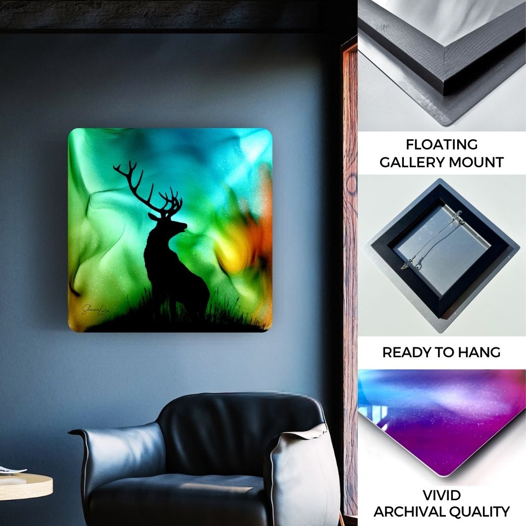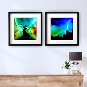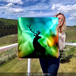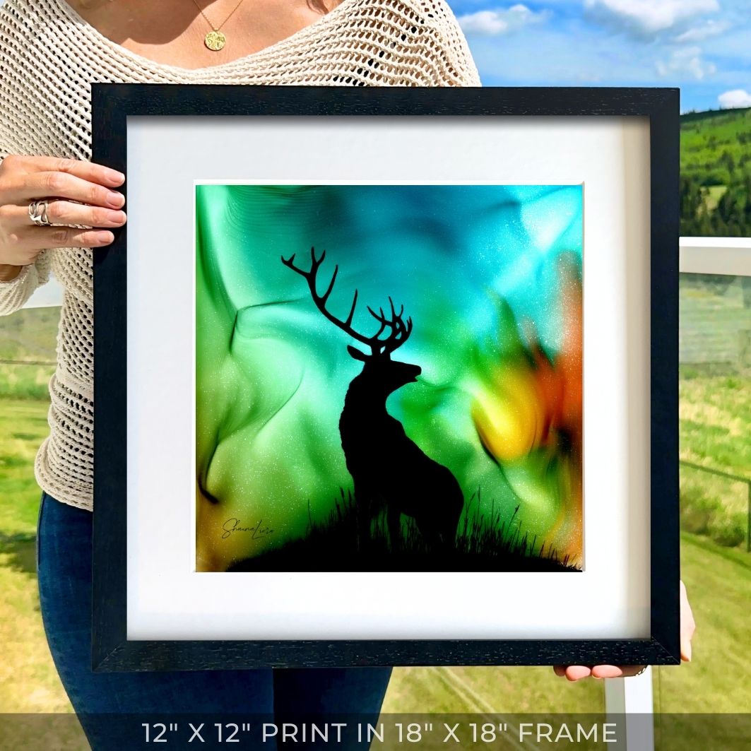 The majestic elk, set against a backdrop of swirling fire and ink. This silent witness is drawn into the night sky as it comes alive in a beautiful dance.