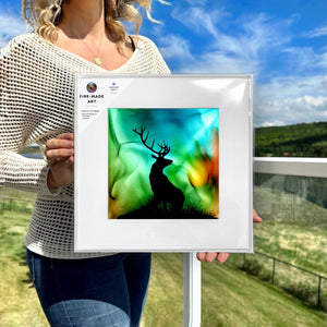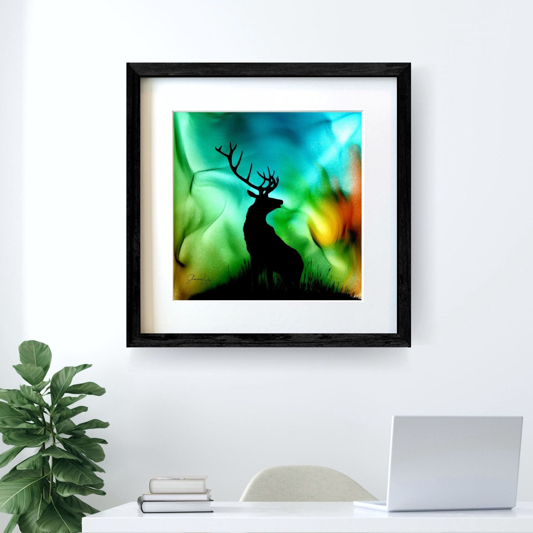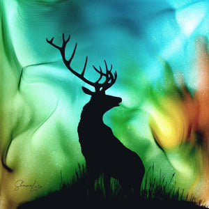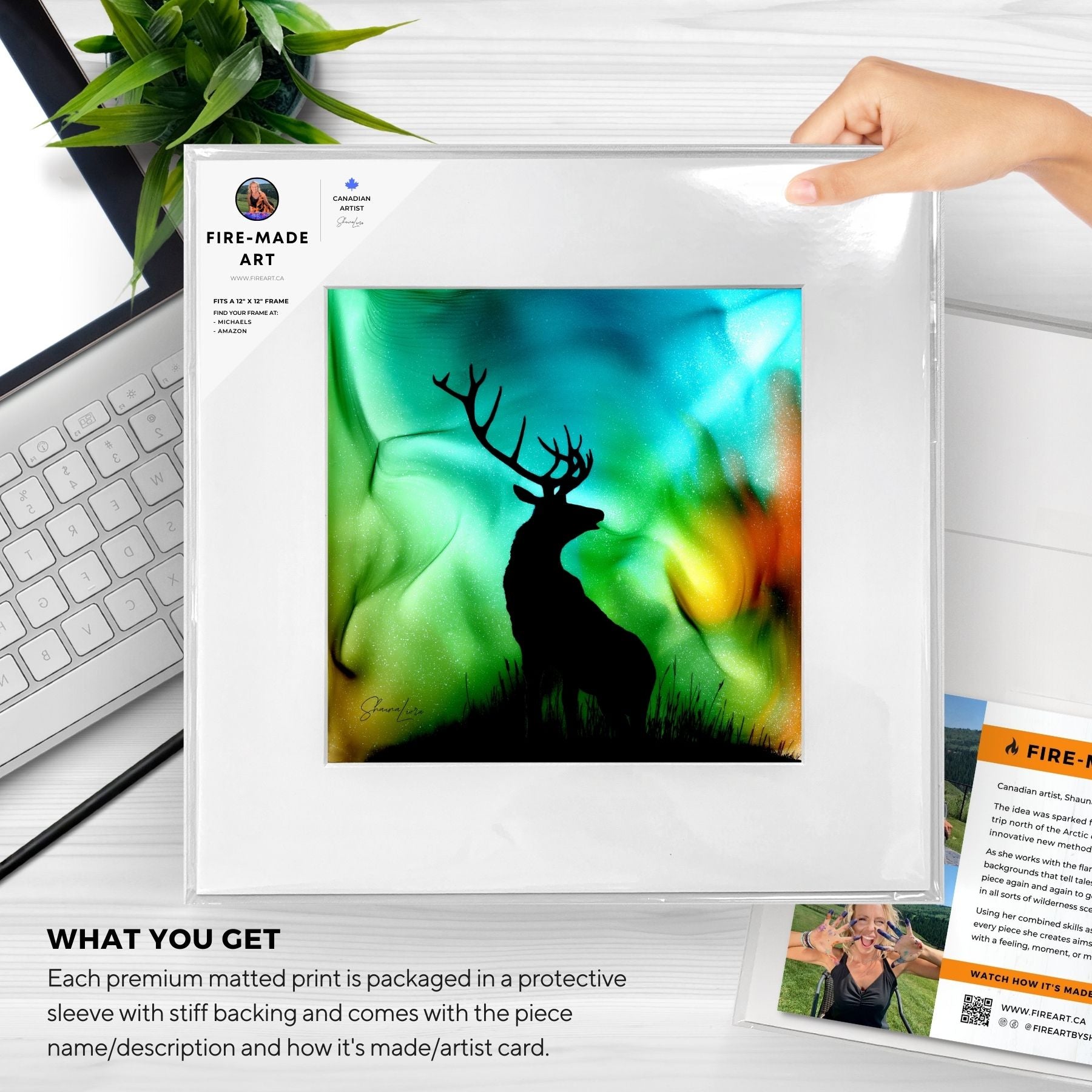 The majestic elk, set against a backdrop of swirling fire and ink. This silent witness is drawn into the night sky as it comes alive in a beautiful dance.