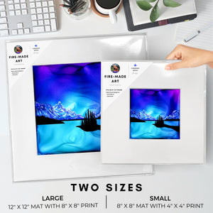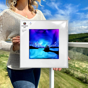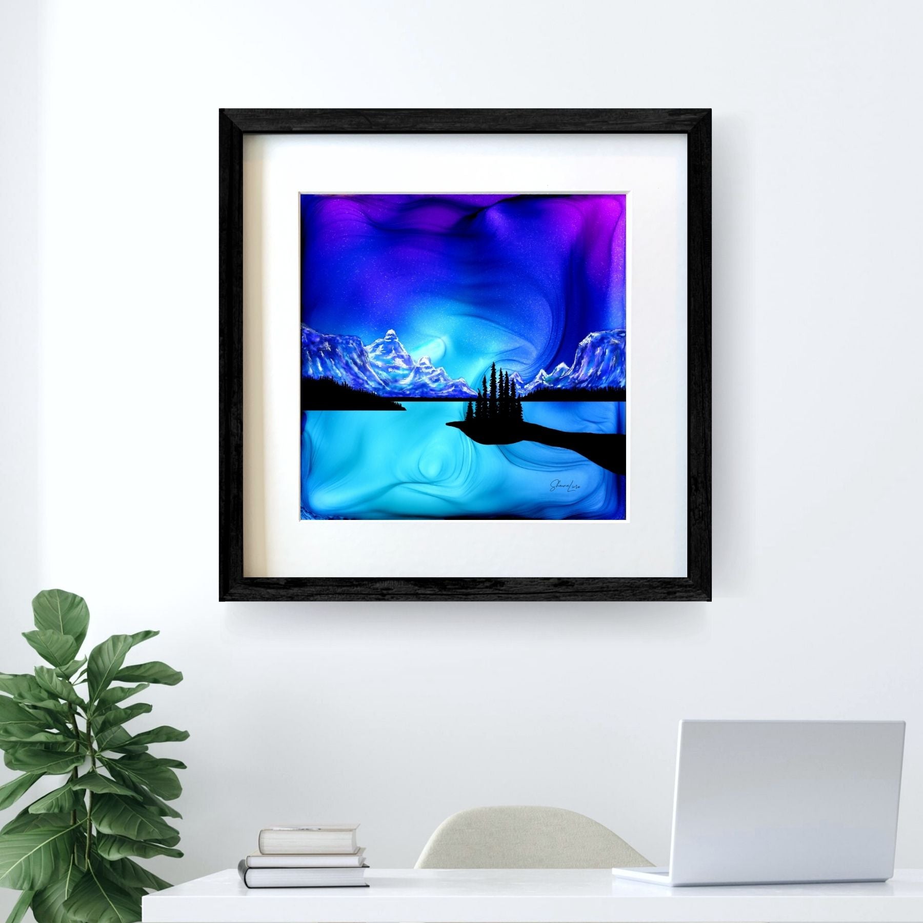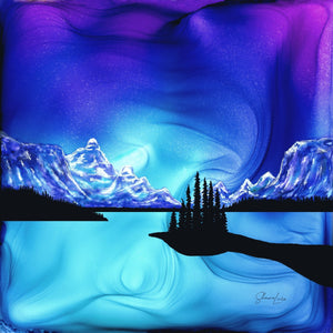 The beauty of Spirit Island draws you in. Surrounded on three sides by the same breathtaking mountain range and glacier-fed waters of Maligne Lake in Jasper National Park. Created with fire and ink, the swirling sky and reflecting waters come alive in a luminous dance, honoring one of Canada’s most iconic landscapes.