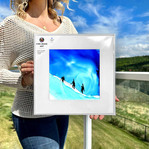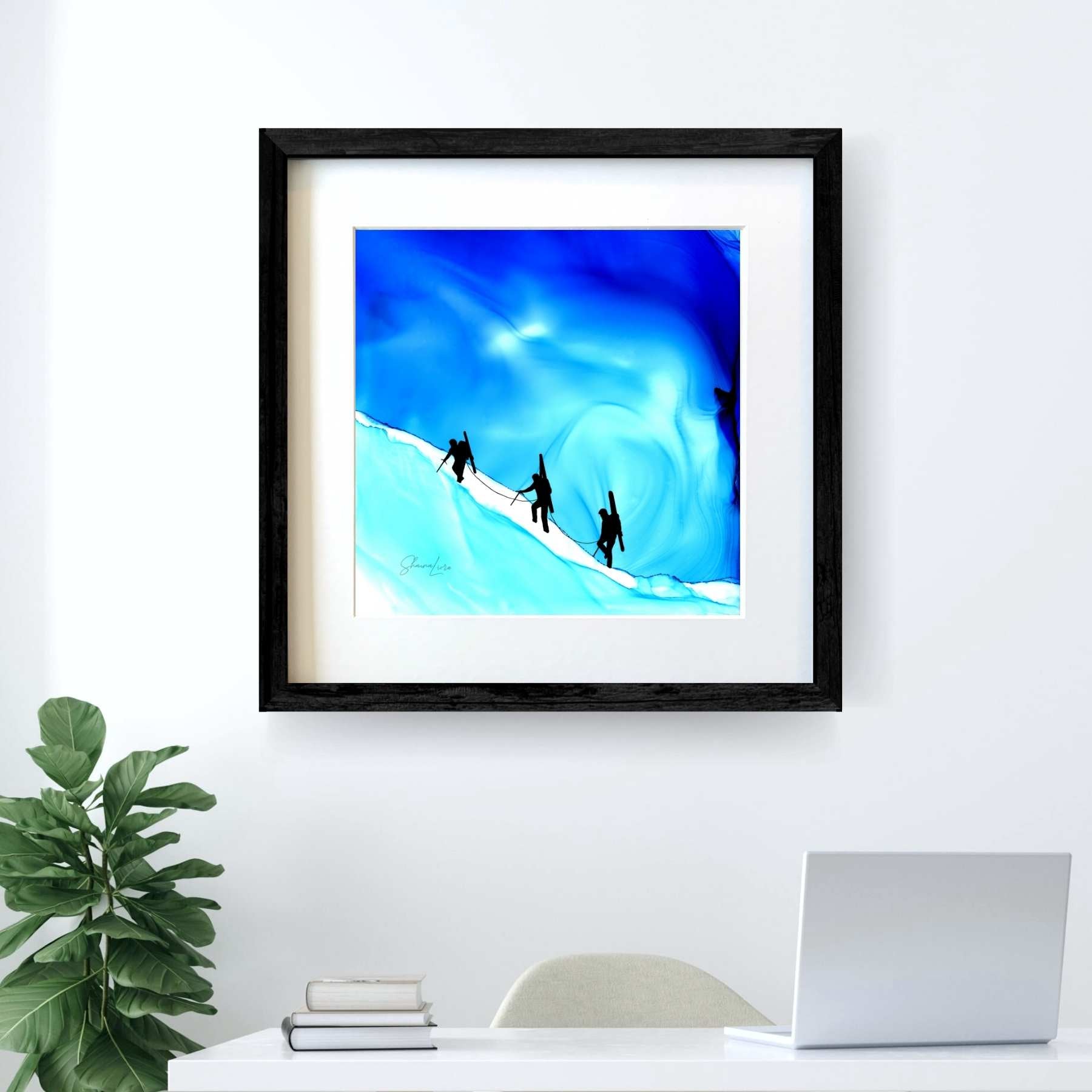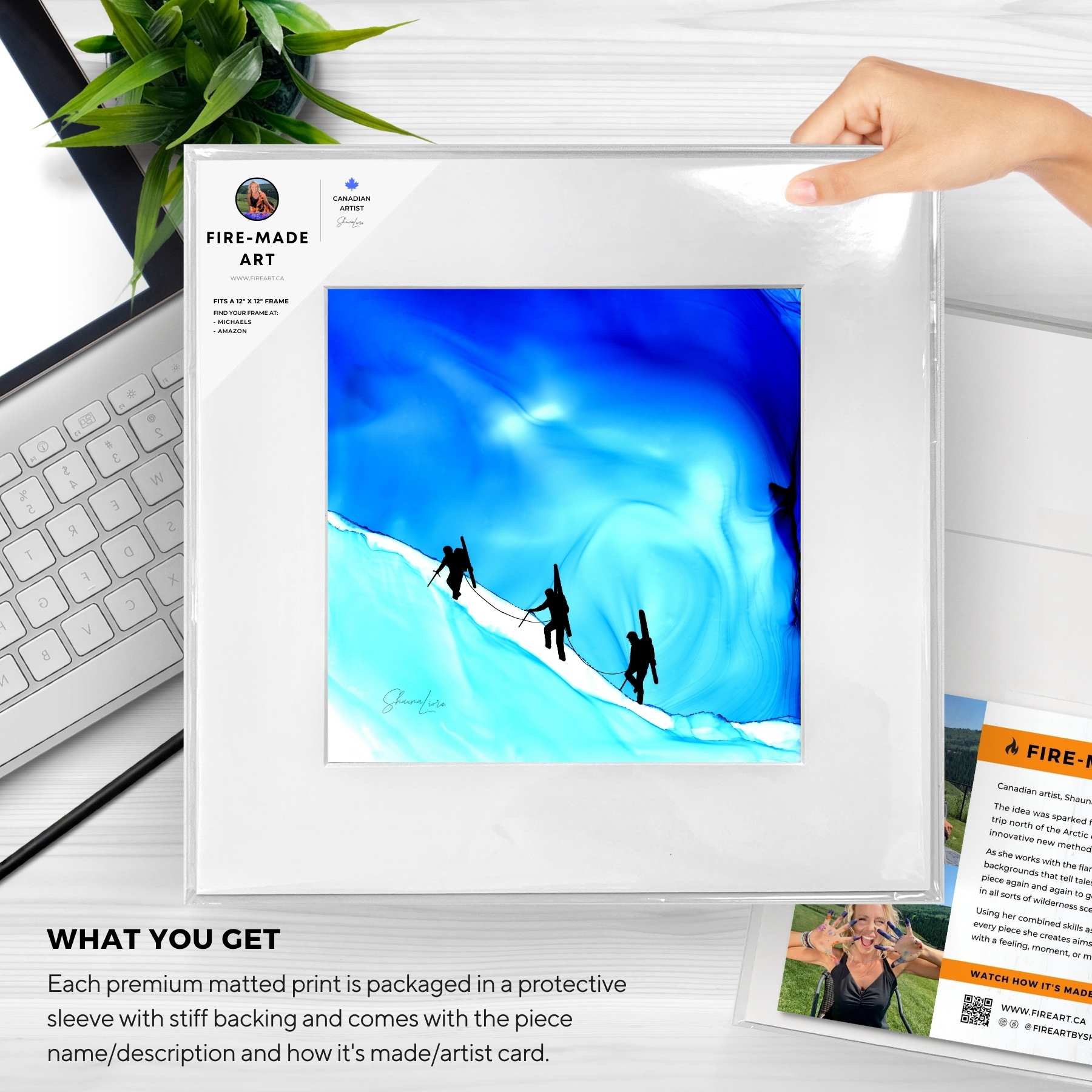 This piece is dedicated to those who choose to get outside no matter the conditions.  On one of my trips on the Wapta Icefield we experienced 5 days of whiteout. The fire and ink in this piece crystallize a moment where the shroud finally lifted the moment it mattered as we made our way safely through the notorious Balfour High Col.