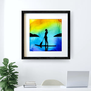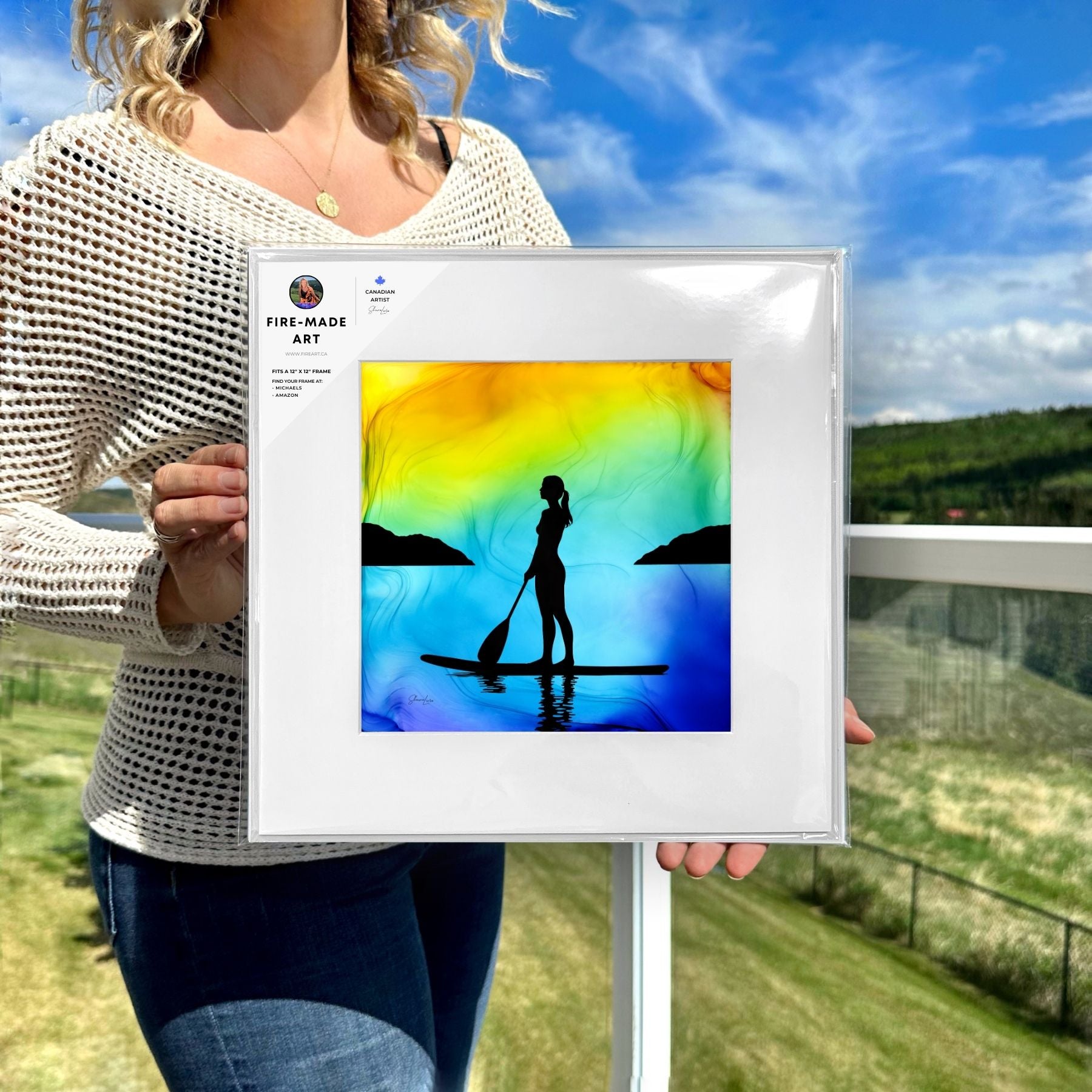As sunset skies surrender into the night a paddleboarder takes a moment to pause and take in the beauty that surrounds her as she glides on the glassy lake.  This piece, made with fire and ink, was created to capture that feeling of serenity and peace when we lose ourselves in the places we love.