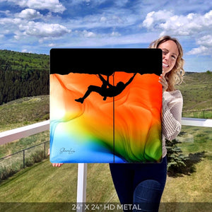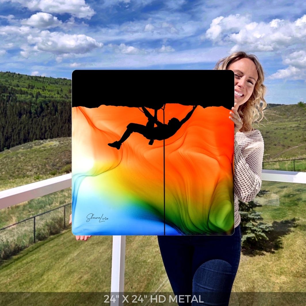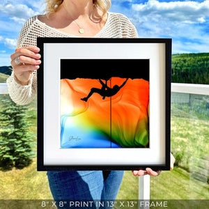 A lone climber pushes to the edge of their ability, created with fire and ink, this piece celebrates those who seek to live life outside the comfort zone.