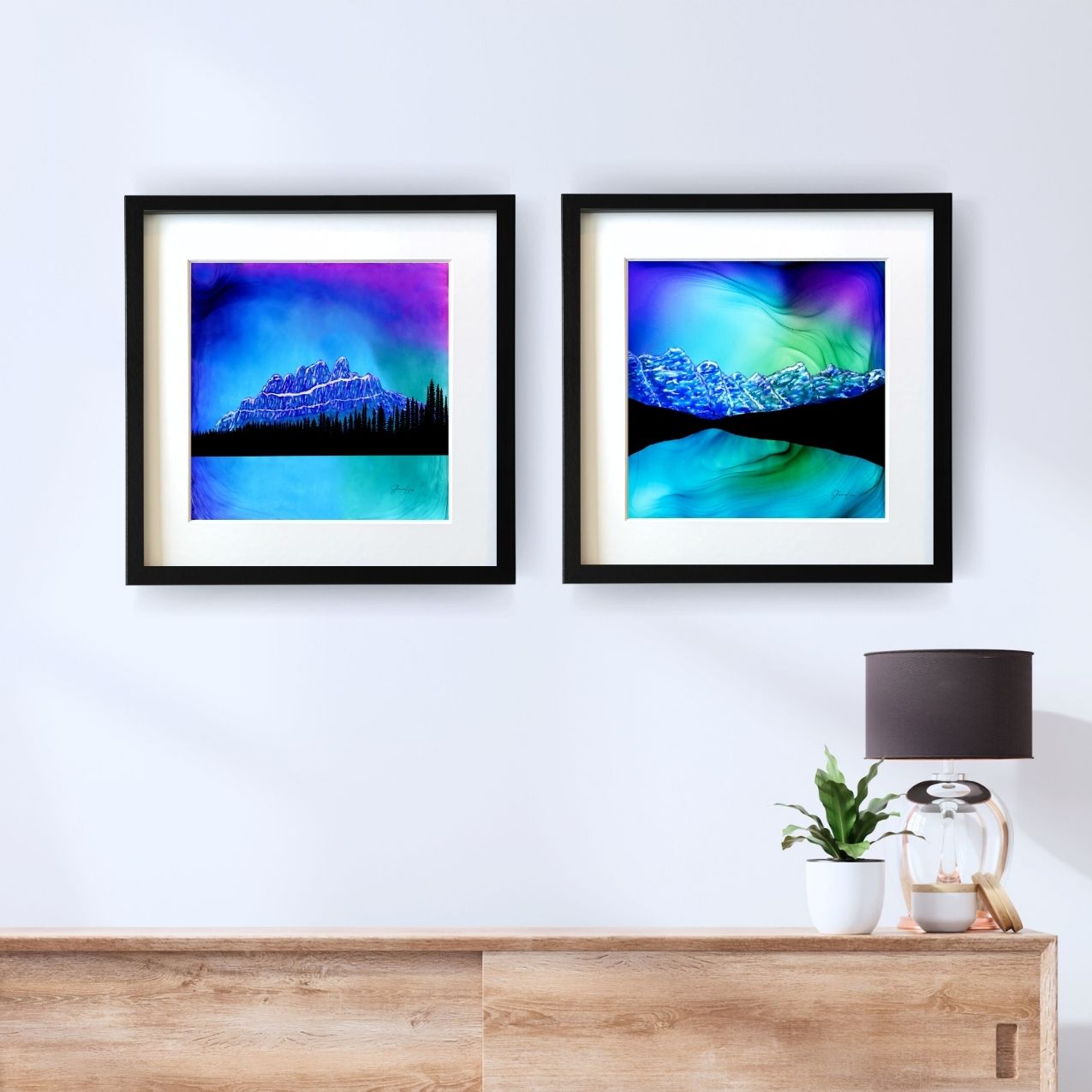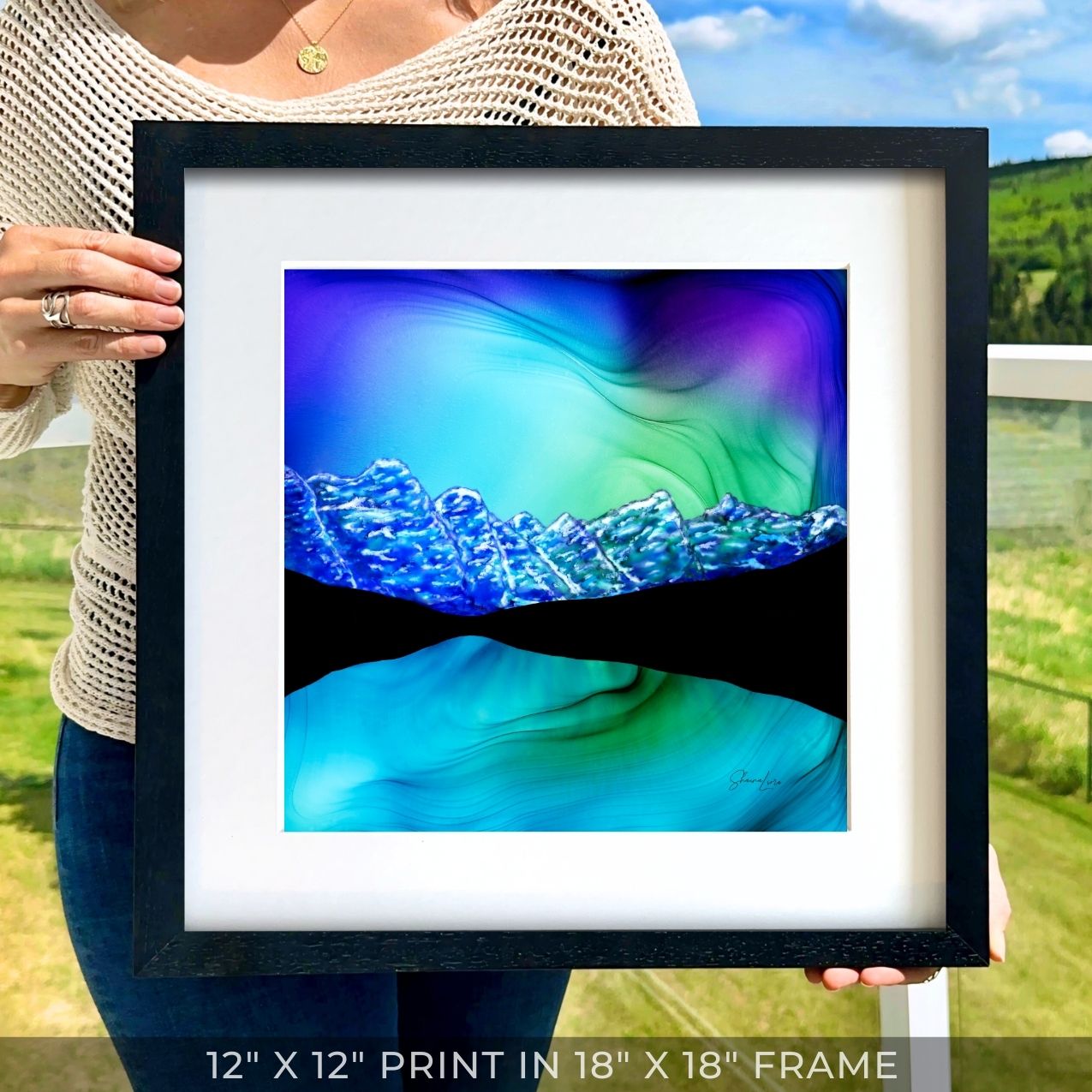 The peaks surrounding the waters of Morraine Lake reach for the sky in this iconic mountain scene in Banff National Park. The swirls and colours made by the fire and ink help to capture the beauty of this magical place.
