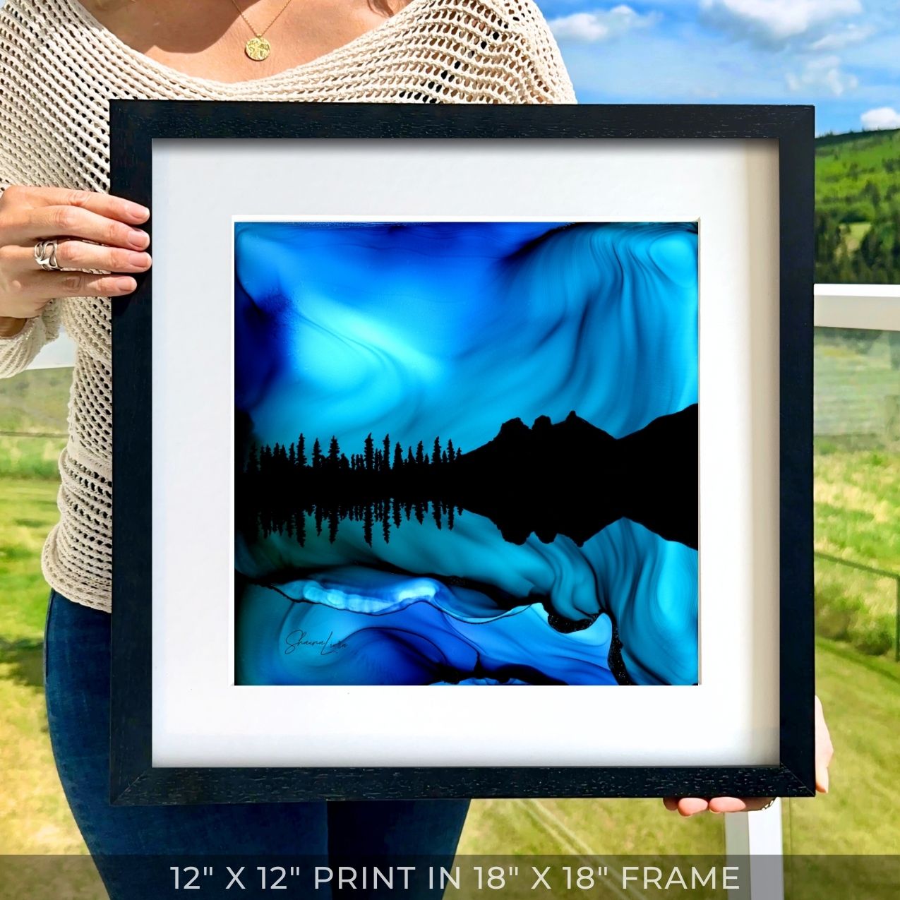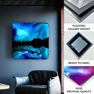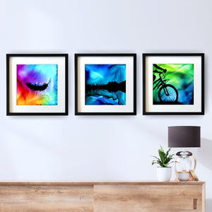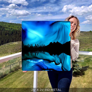 I was inspired to create this piece of the Three Sisters Mountains in Canmore after a night spent watching the Northern lights in the Canadian Rockies.  The fire and ink produced a breathtaking blue symphony of lights beyond distant peaks, rippling and shimmering on the water.