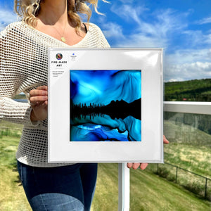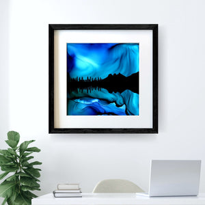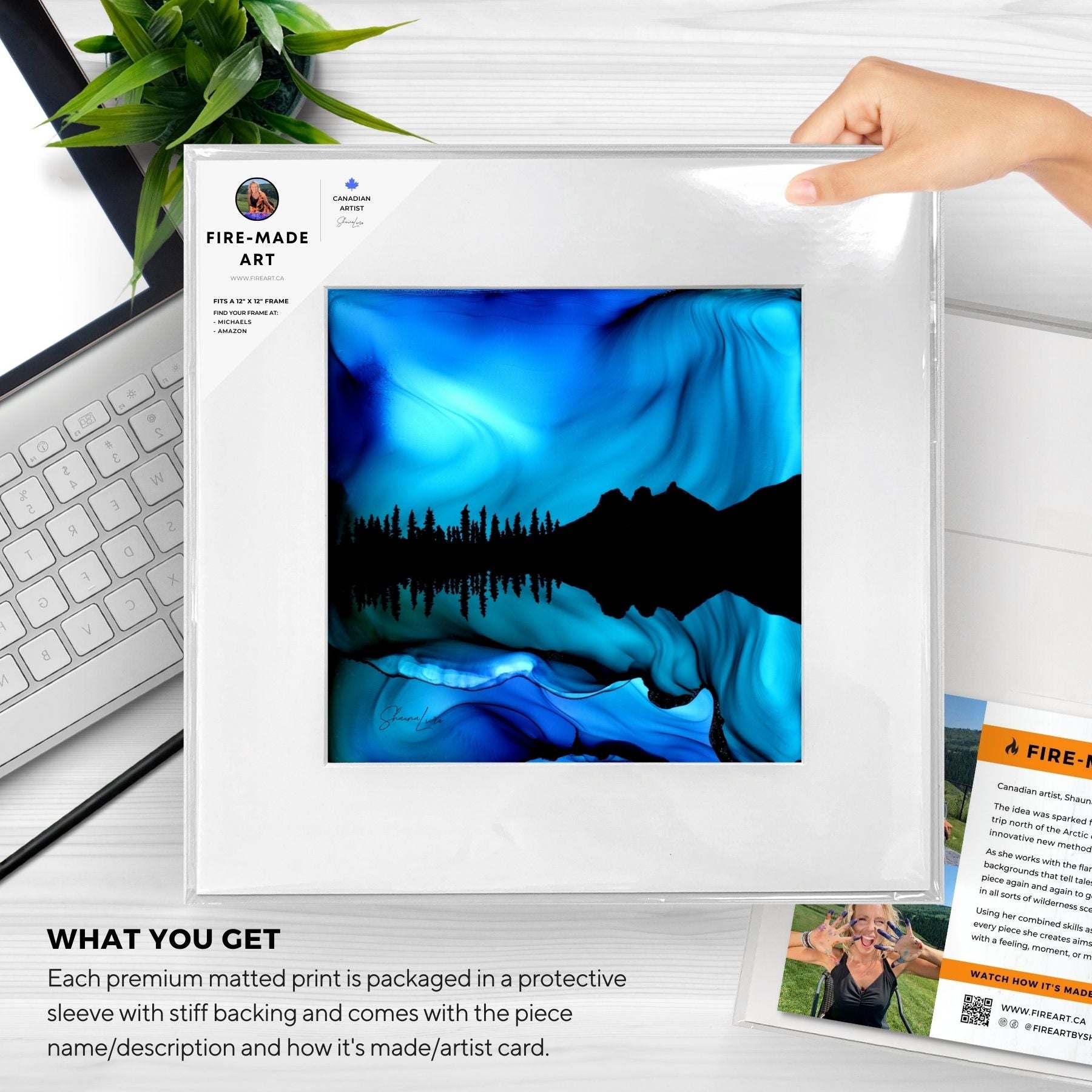 I was inspired to create this piece of the Three Sisters Mountains in Canmore after a night spent watching the Northern lights in the Canadian Rockies.  The fire and ink produced a breathtaking blue symphony of lights beyond distant peaks, rippling and shimmering on the water.